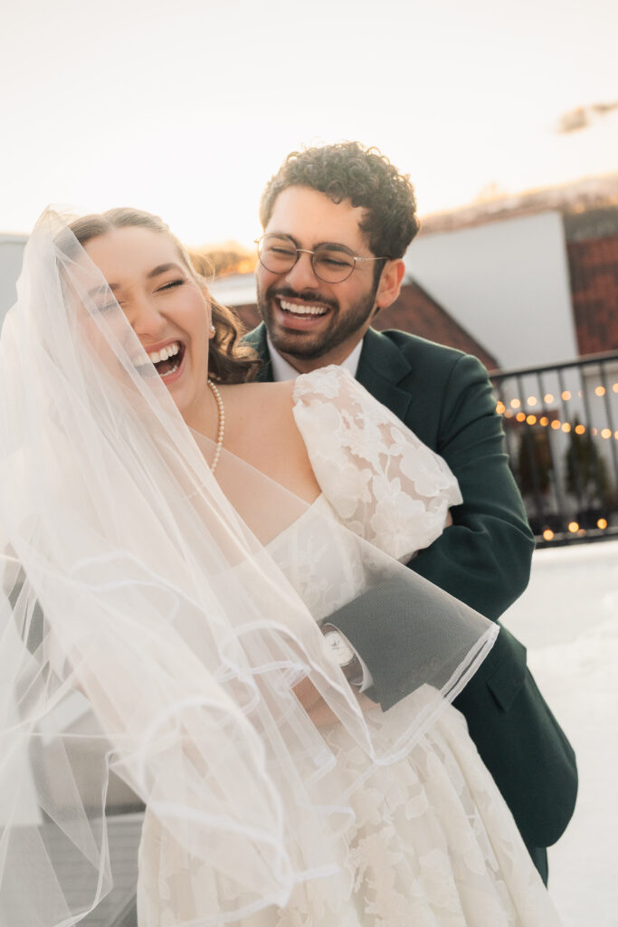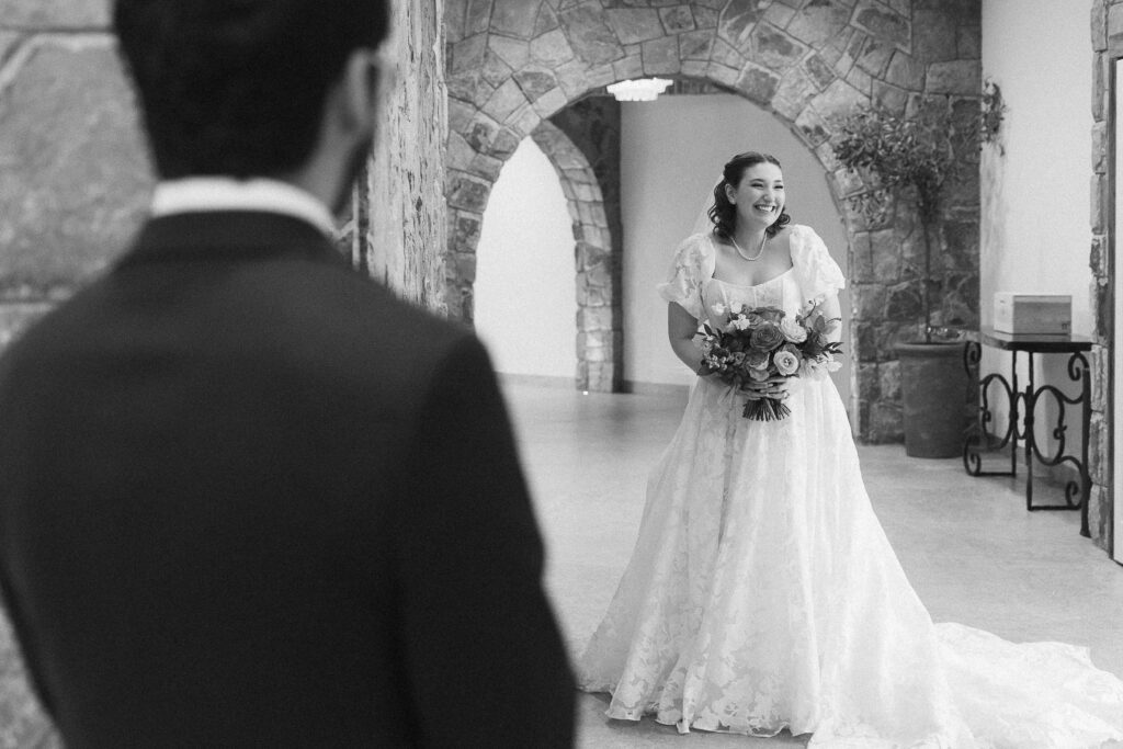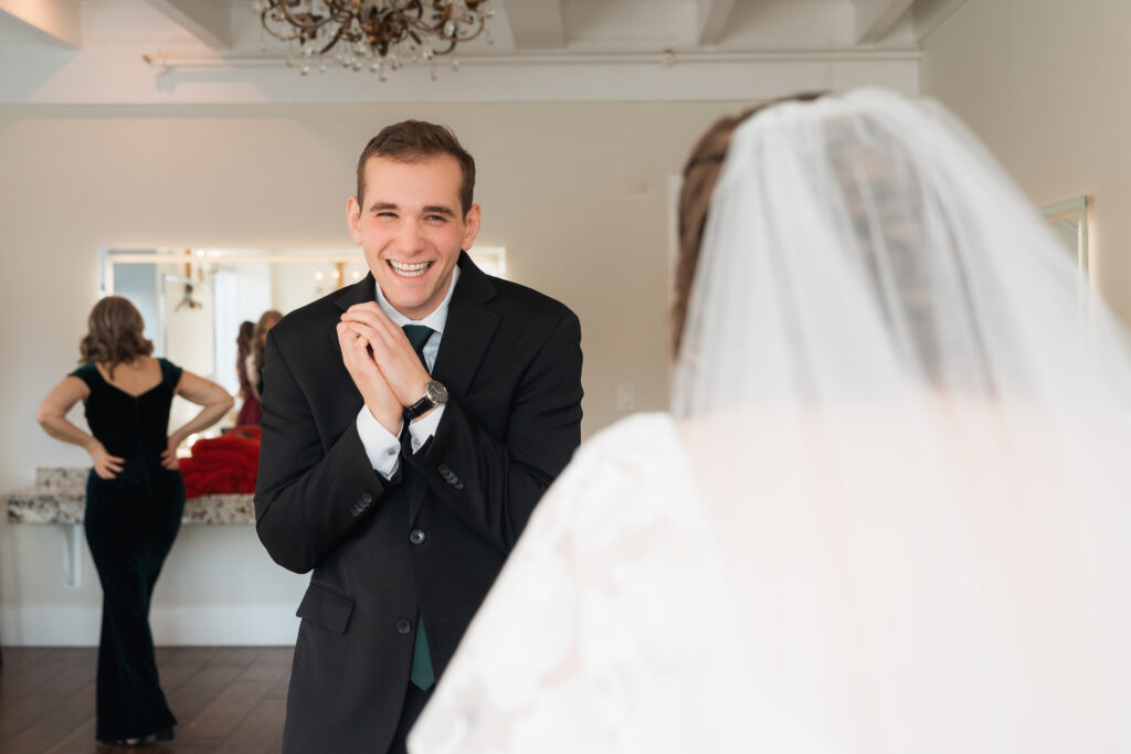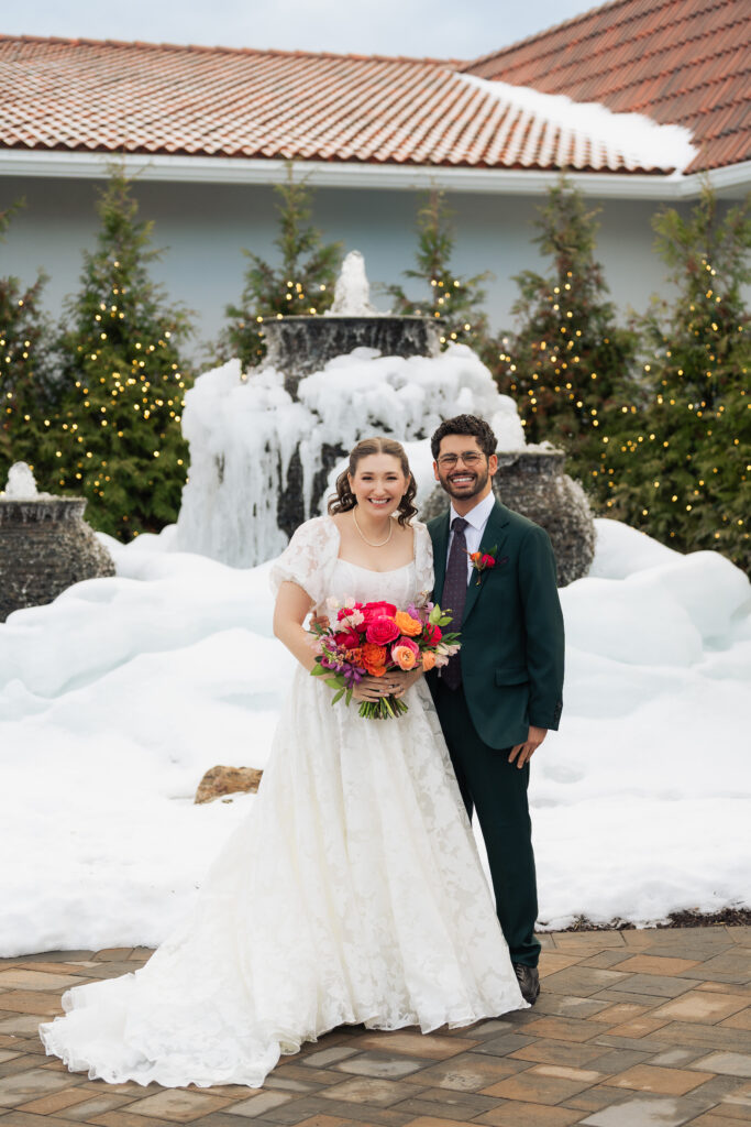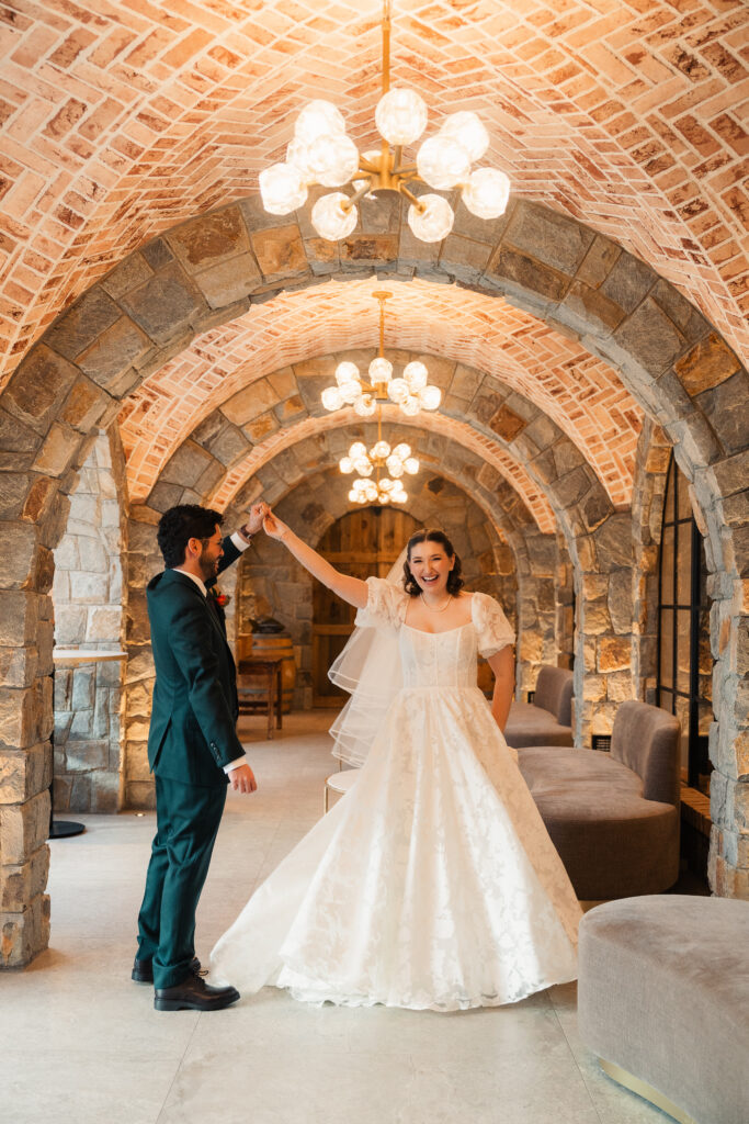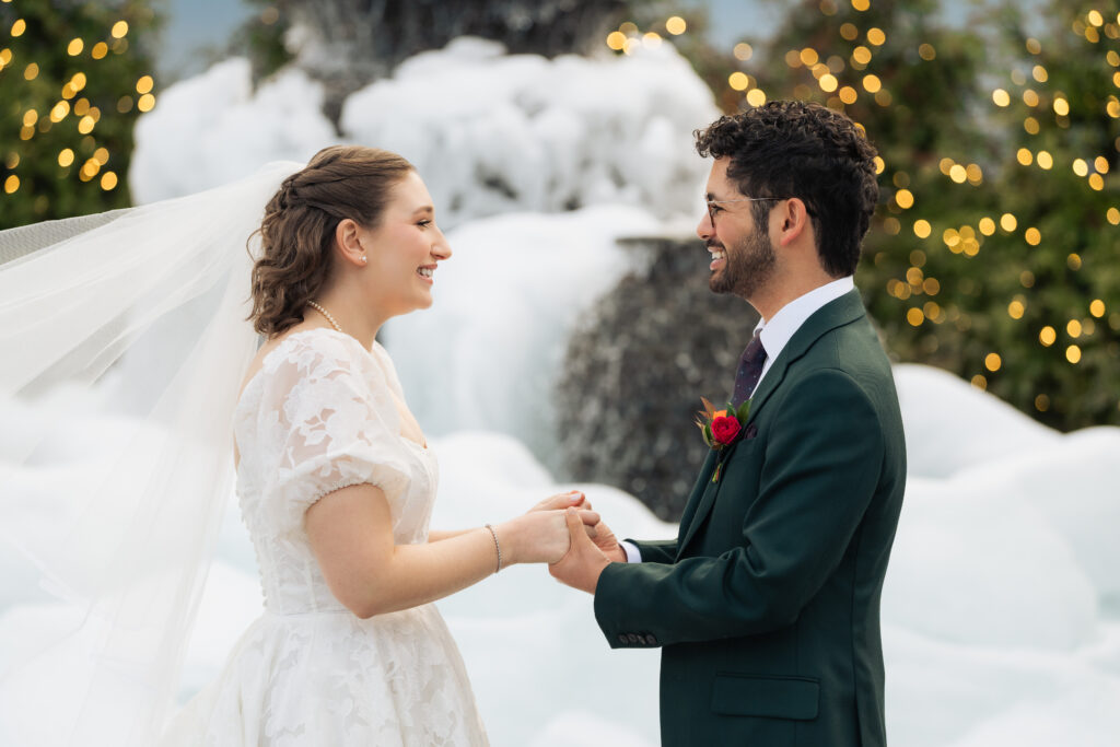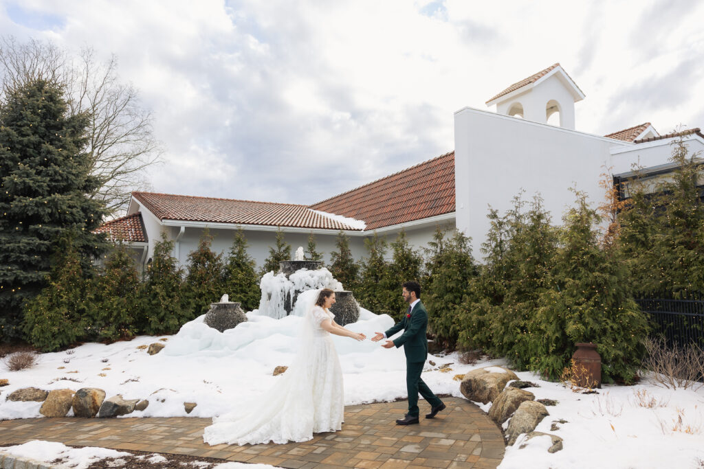 Rafi and Lea’s winter wedding at Perona Farms in Andover, New Jersey was the definition of a true seasonal celebration, with fresh snow blanketing the property and snow-capped trees framing every moment. Lea got ready with joyful anticipation, wearing a romantic floral Anthropologie gown with puff sleeves and her mother’s pearls as her something borrowed. After fueling up with her favorite Dunkin’ drink, she shared an emotional first look with her brother—wide smiles and happy tears all around. Lea and Rafi then met outside the venue for their first look, surrounded by quiet winter beauty. Rafi’s reaction was pure joy as they melted into each other, and we spent time wandering the grounds for playful, cozy portraits that highlighted Perona Farms’ rustic charm, stone details, and peaceful winter landscape.
