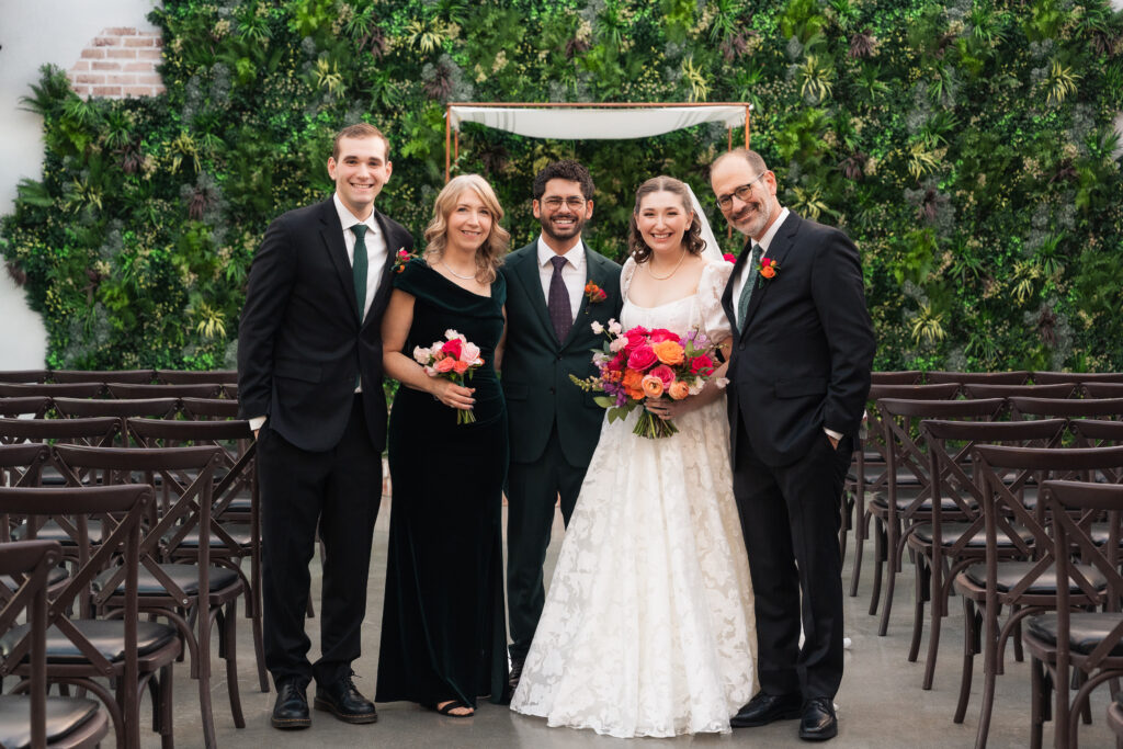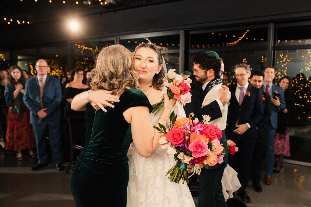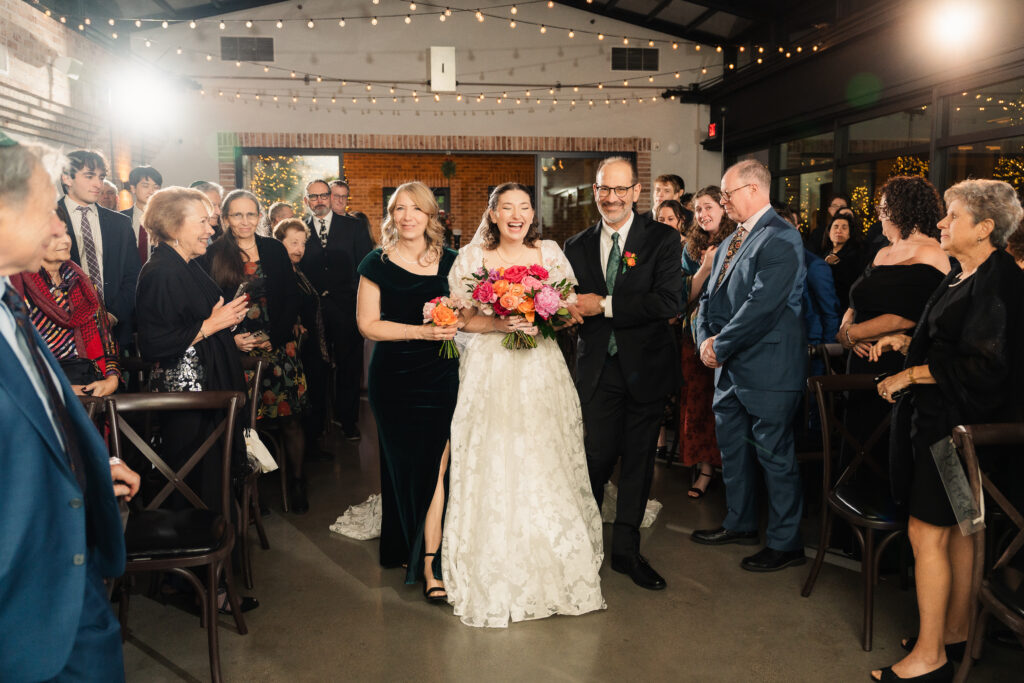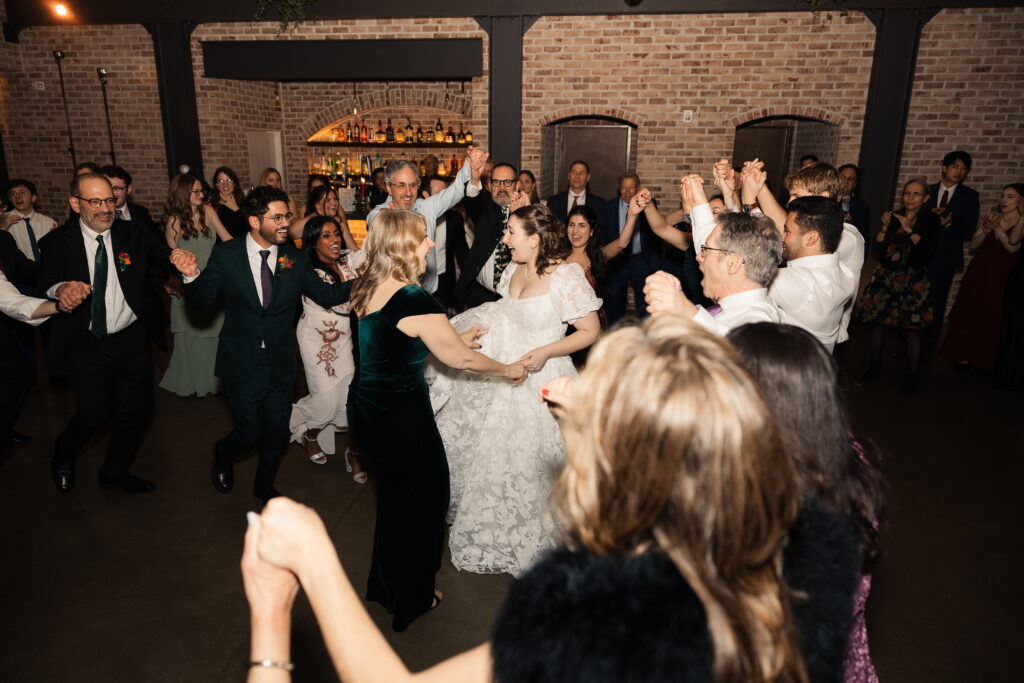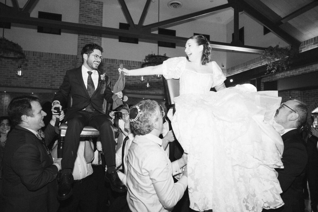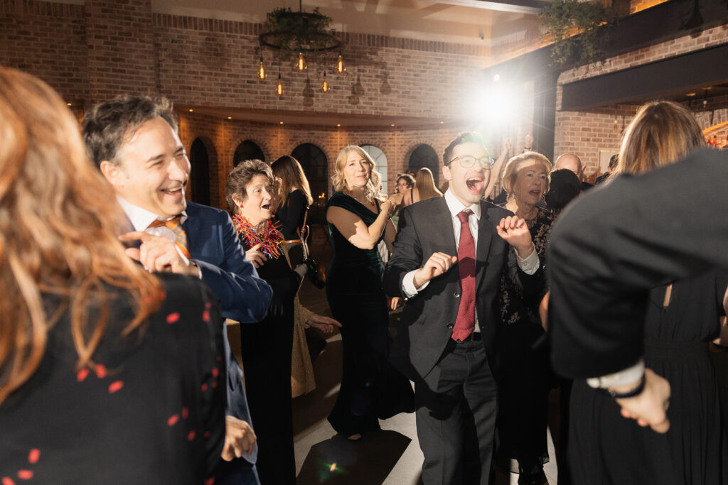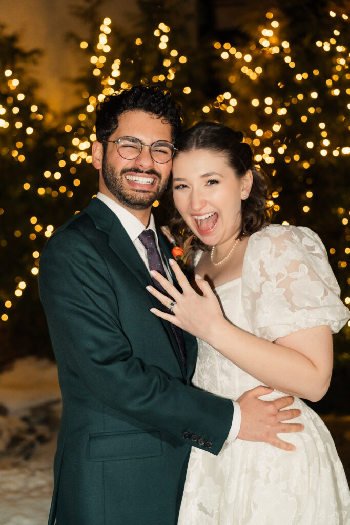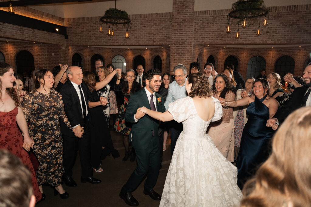 Their ceremony took place inside The Refinery at Perona Farms, a greenhouse-inspired space glowing with warm bistro lights that perfectly contrasted the snowy day outside. A chuppah overflowing with bright, colorful florals brought vibrant life to the winter neutrals, setting the tone for a deeply emotional ceremony filled with heartfelt vows, meaningful traditions, and the breaking of the glass. Cocktail hour followed with extravagant stations and incredible energy before guests moved into a lively reception filled with bold florals, pops of pink, and nonstop celebration. Lea twirled during their first dance, speeches were both hilarious and heartwarming, and the rest of the night unfolded with spirited horas and joyful dancing—proof that even in the heart of winter, Rafi and Lea’s love brought nothing but warmth. Lastly, we even ran out into the cold to take nighttime, dramatic photos with the property trees all lit up!