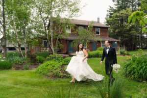 Cat and Mike’s June wedding at the stunning Arnold House in Livingston Manor, New York, was a dreamy celebration full of classic elegance and lush greenery. The day began with a heartfelt first look outside one of the charming guest houses, surrounded by vibrant floral arrangements in soft whites and verdant greens. Cat looked effortlessly timeless in her white crepe dress, while Mike stunned in a black-and-white tuxedo with a bow tie and vintage pin. Their bridal party wore soft pastel tones that perfectly complemented the floral-focused design. Guests walked through a scenic meadow to reach the outdoor ceremony, where handwritten vows, emotional laughter, and petal tosses created magical, unforgettable moments.