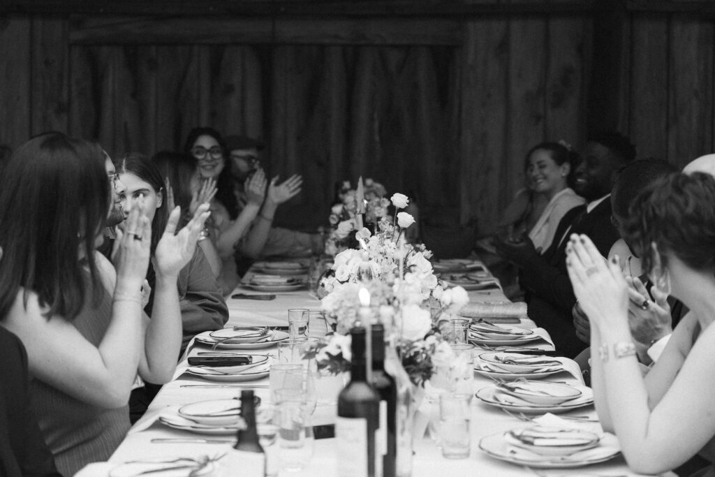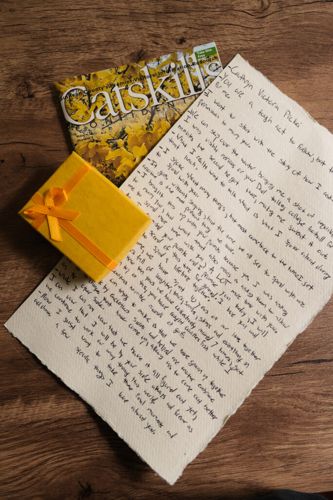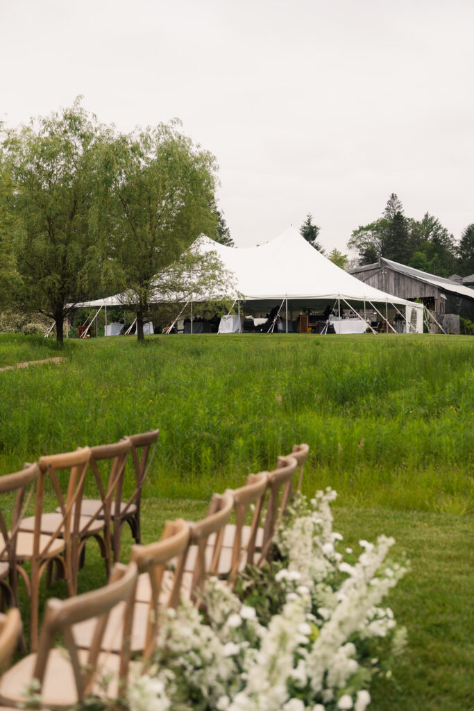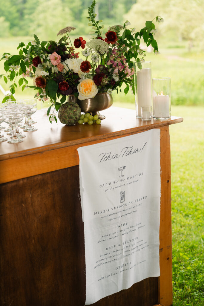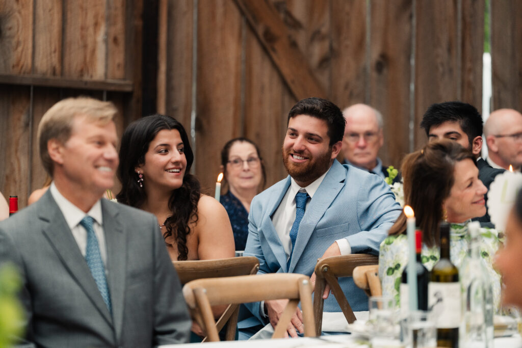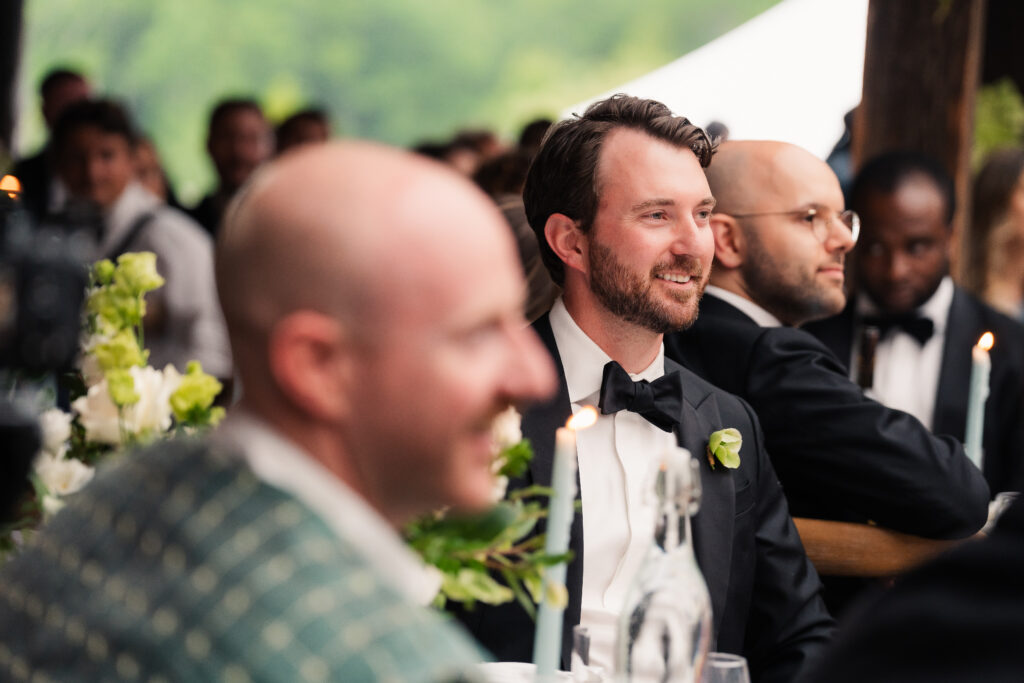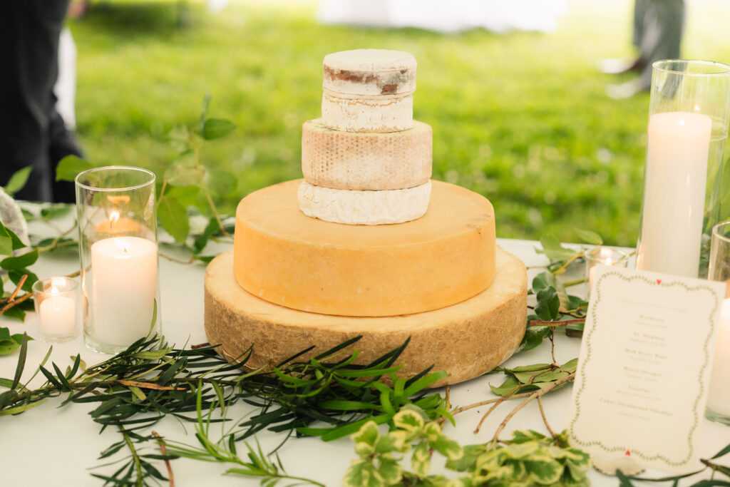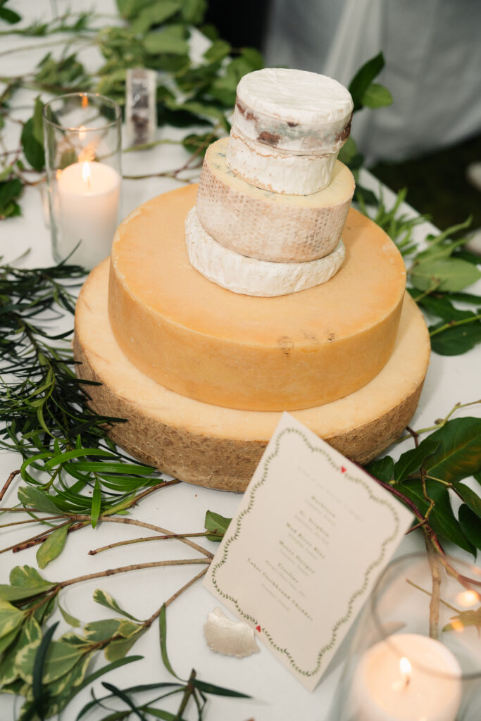 Following the ceremony, the celebration continued under a white tent for cocktail hour, complete with live saxophone music and fresh seafood by the poolside and fire pit area. The reception inside the Arnold House showcased rustic elegance with open wooden beams, hanging greenery, and organic floral décor accented with green velvet bows and soft blue tapered candlesticks. Speeches were heartfelt, and the couple’s unique cheese wheel “cake” added a playful touch to the classy evening. From intimate outdoor details to the cozy, rustic interior, Cat and Mike’s wedding perfectly blended natural charm with timeless sophistication, making it a truly memorable day in upstate New York.