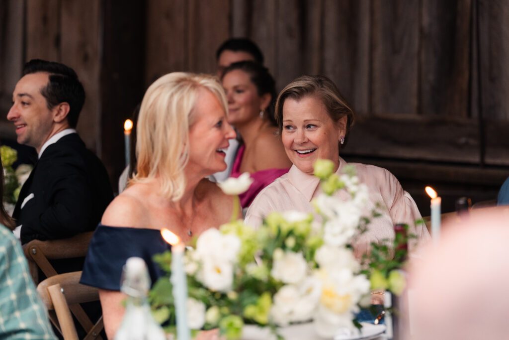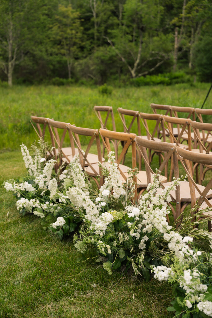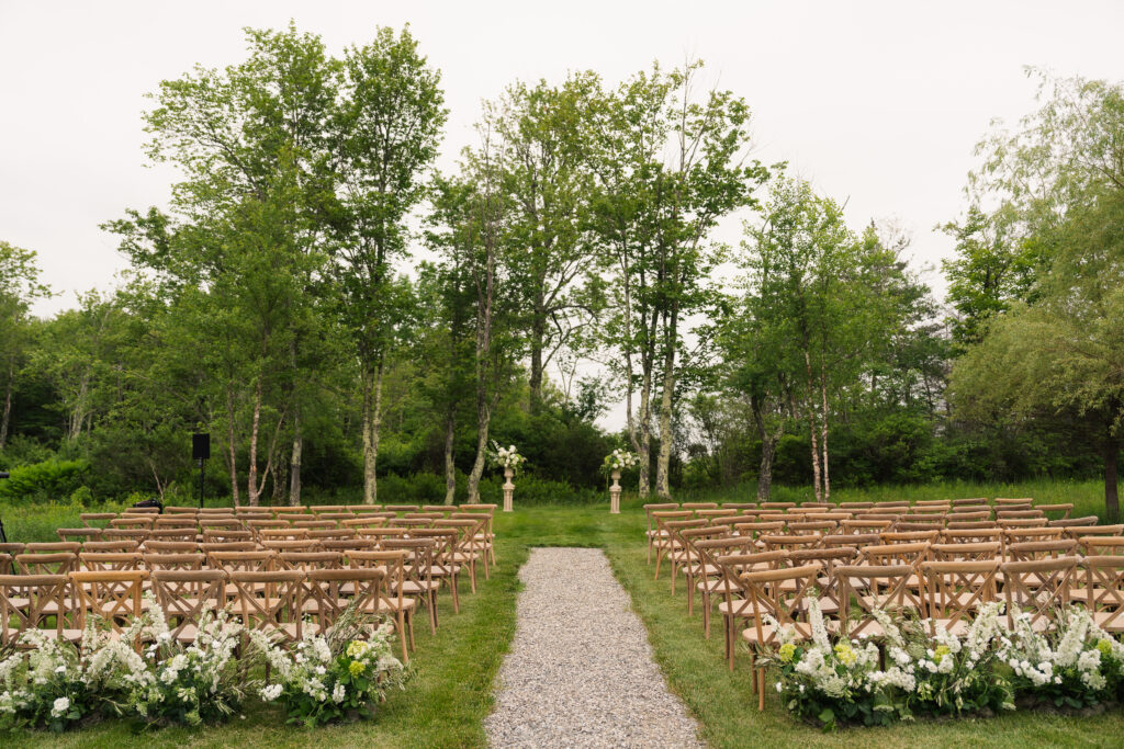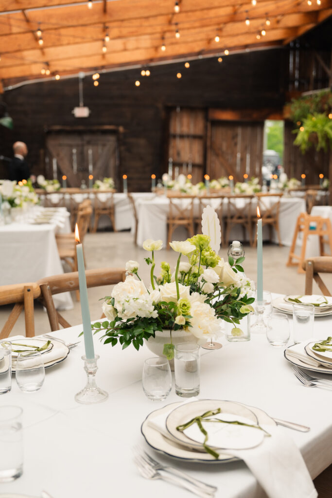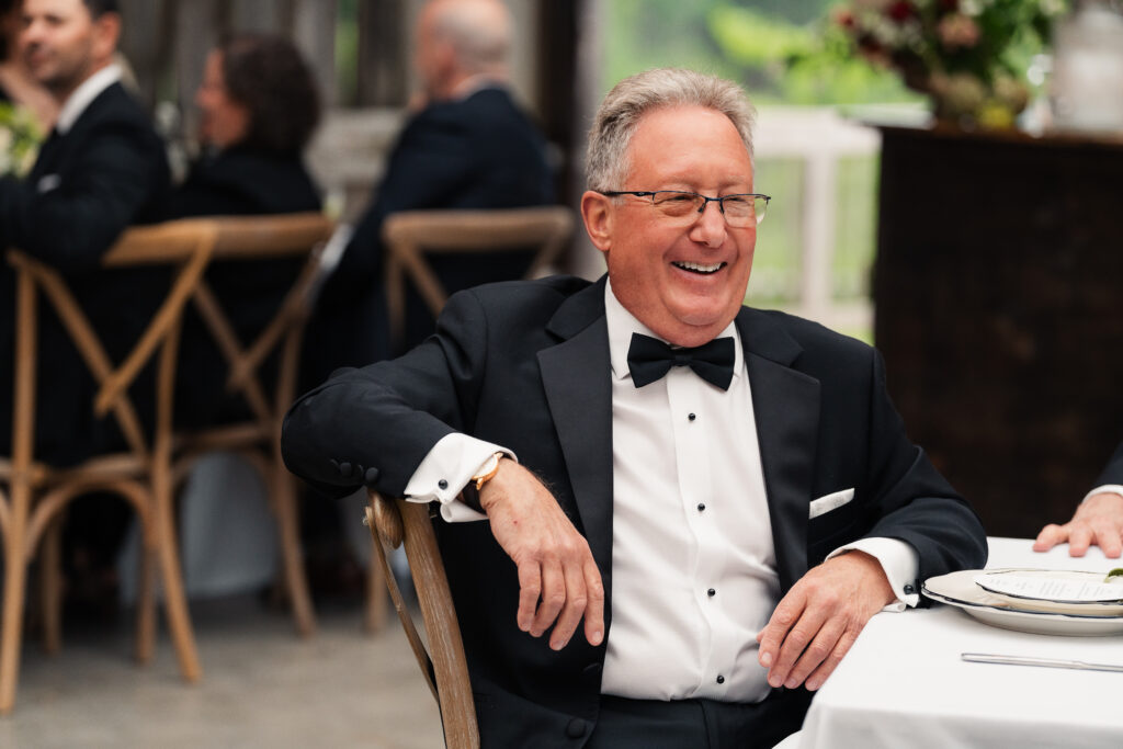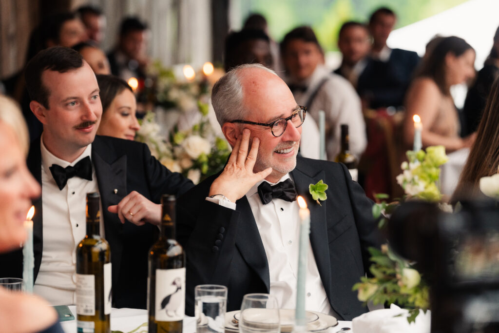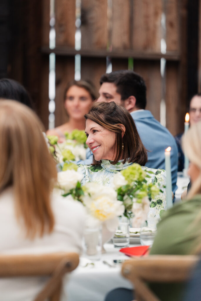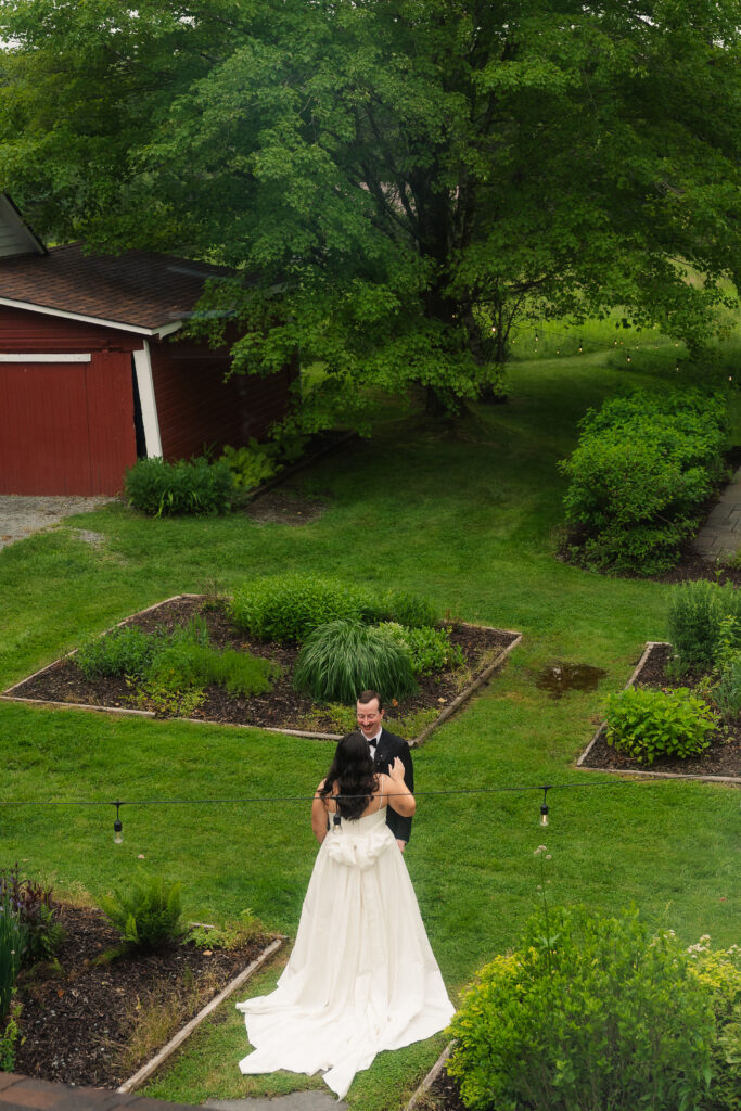 Following the ceremony, the celebration continued under a white tent for cocktail hour, complete with live saxophone music and fresh seafood by the poolside and fire pit area. The reception inside the Arnold House showcased rustic elegance with open wooden beams, hanging greenery, and organic floral décor accented with green velvet bows and soft blue tapered candlesticks. Speeches were heartfelt, and the couple’s unique cheese wheel “cake” added a playful touch to the classy evening. From intimate outdoor details to the cozy, rustic interior, Cat and Mike’s wedding perfectly blended natural charm with timeless sophistication, making it a truly memorable day in upstate New York.