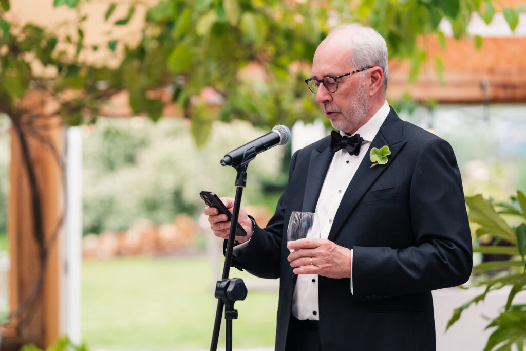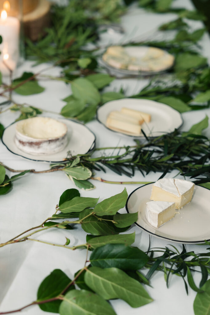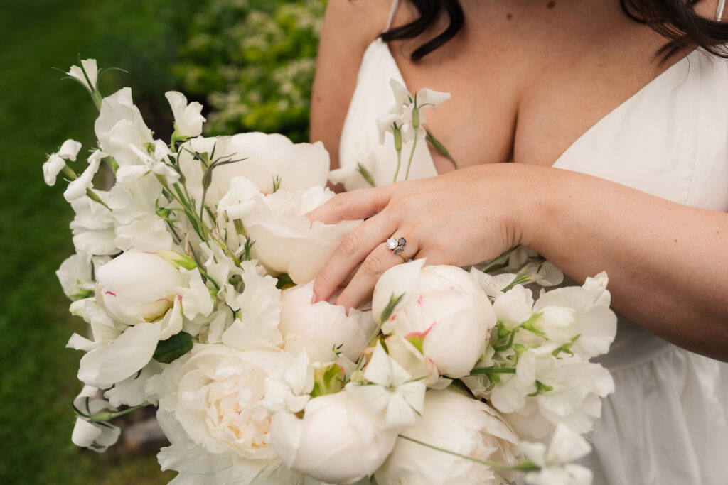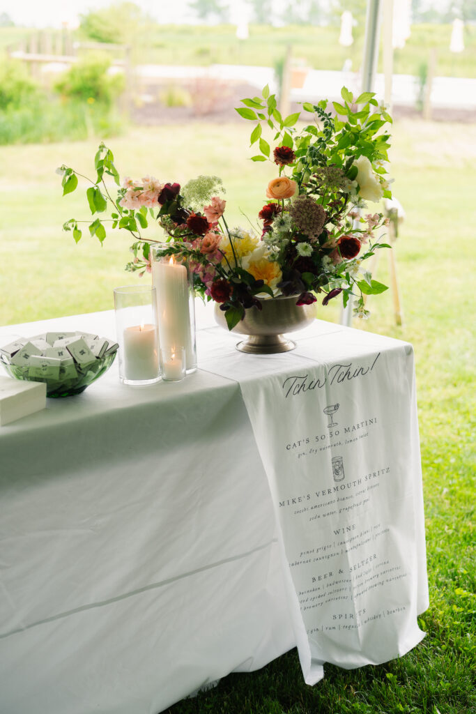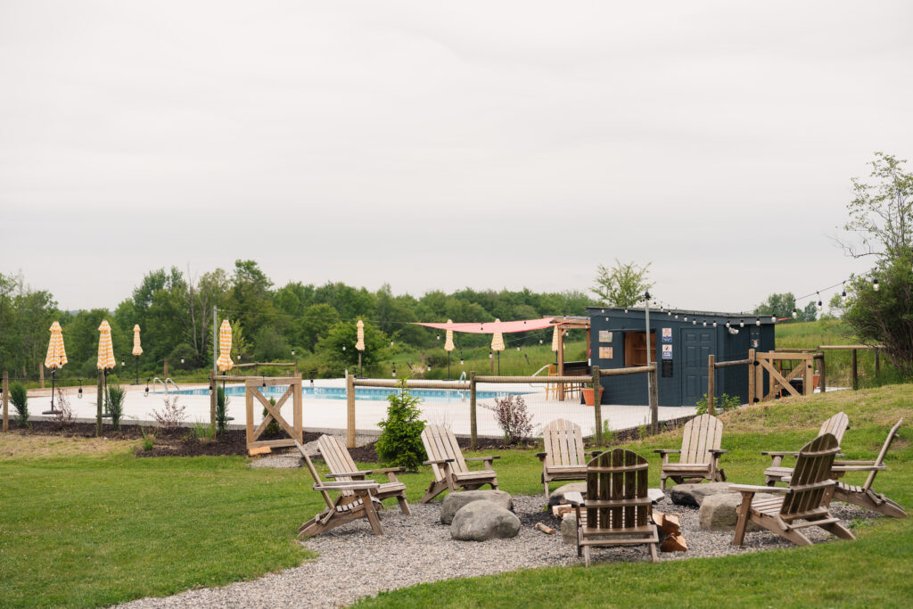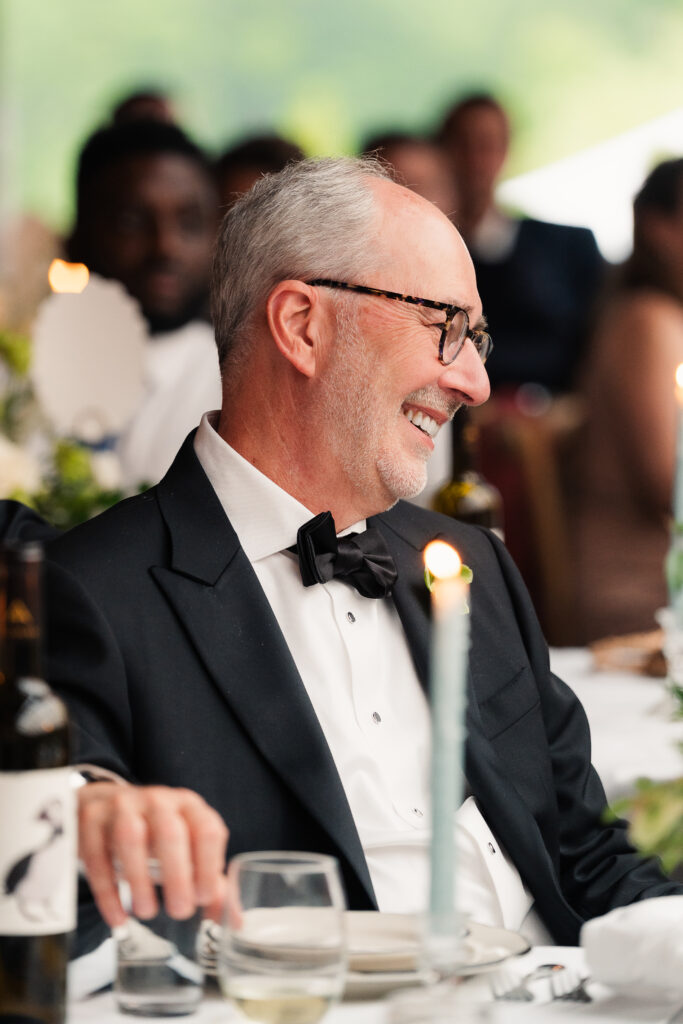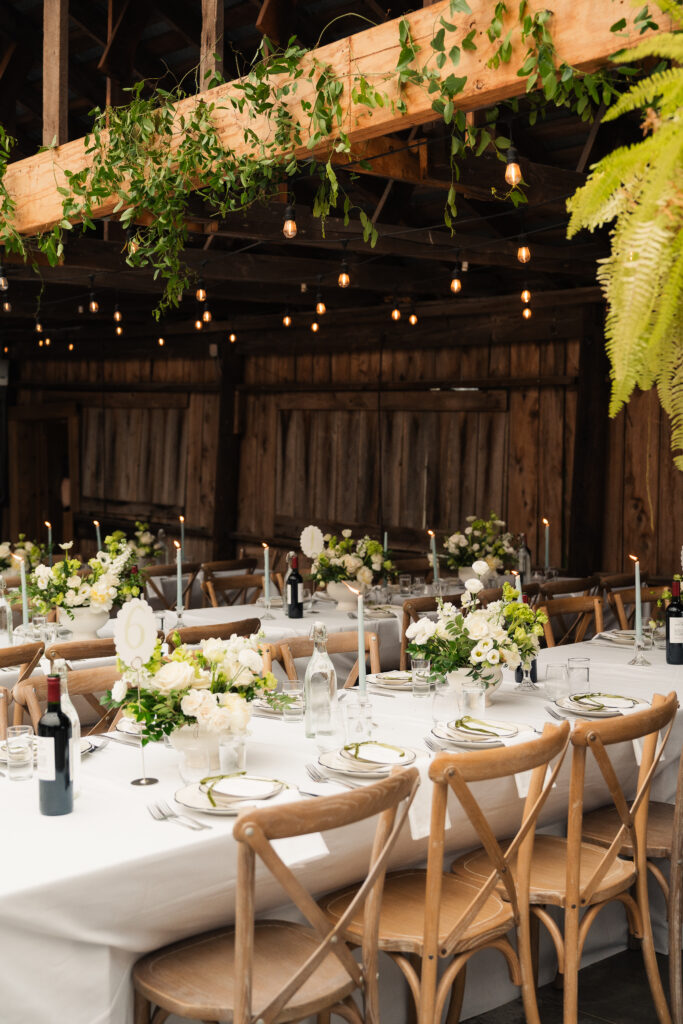 Following the ceremony, the celebration continued under a white tent for cocktail hour, complete with live saxophone music and fresh seafood by the poolside and fire pit area. The reception inside the Arnold House showcased rustic elegance with open wooden beams, hanging greenery, and organic floral décor accented with green velvet bows and soft blue tapered candlesticks. Speeches were heartfelt, and the couple’s unique cheese wheel “cake” added a playful touch to the classy evening. From intimate outdoor details to the cozy, rustic interior, Cat and Mike’s wedding perfectly blended natural charm with timeless sophistication, making it a truly memorable day in upstate New York.