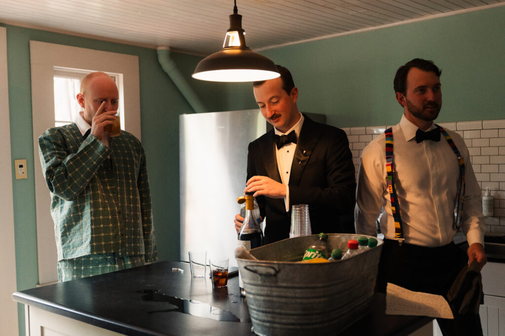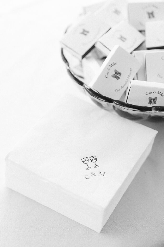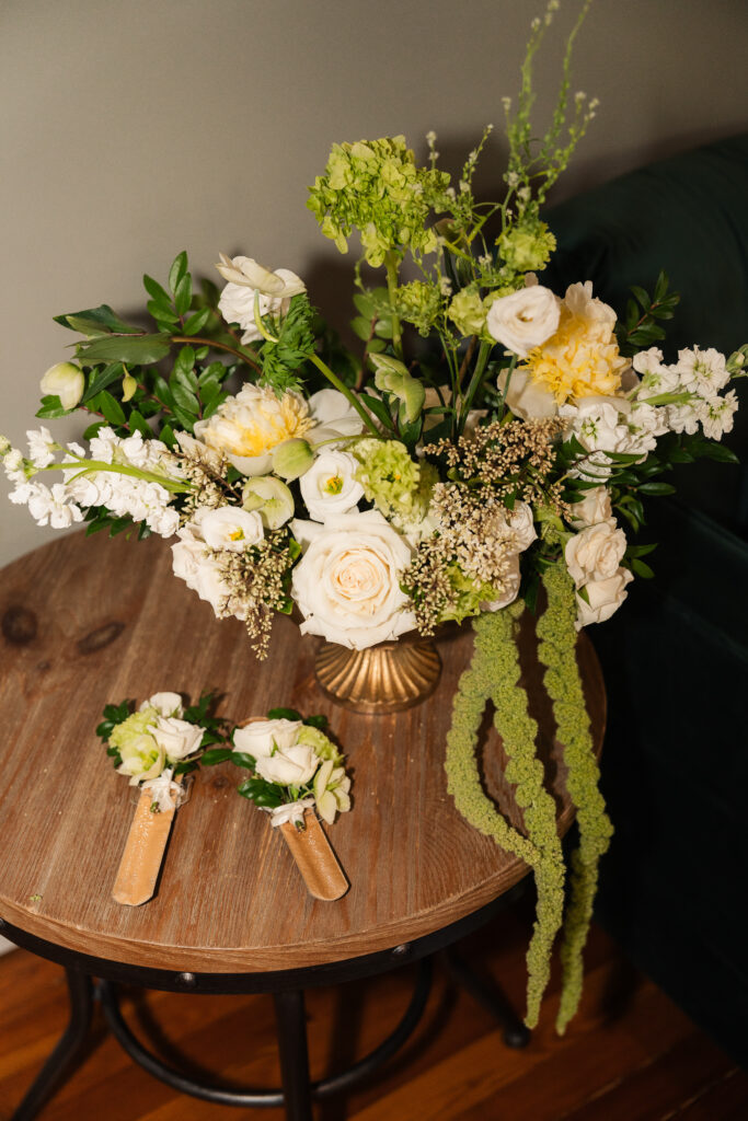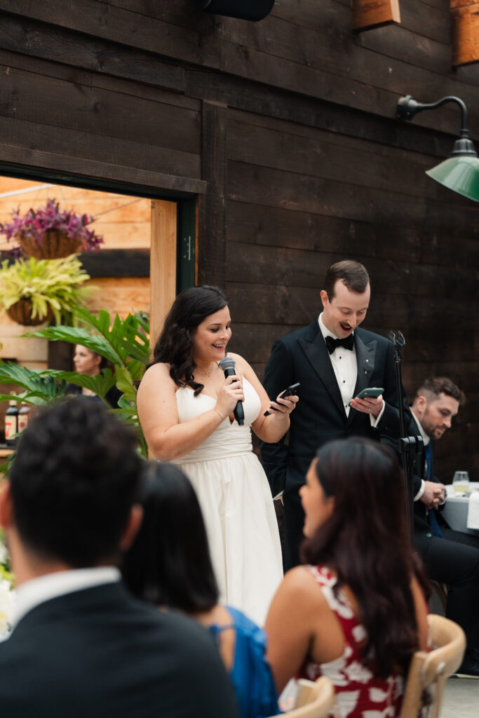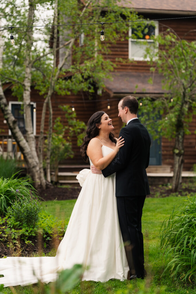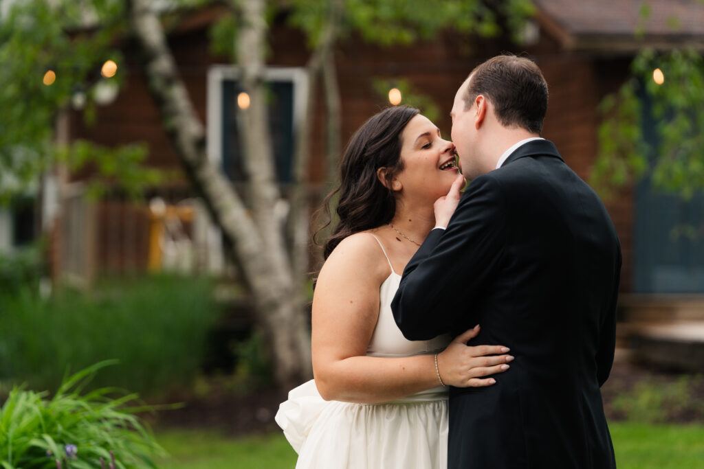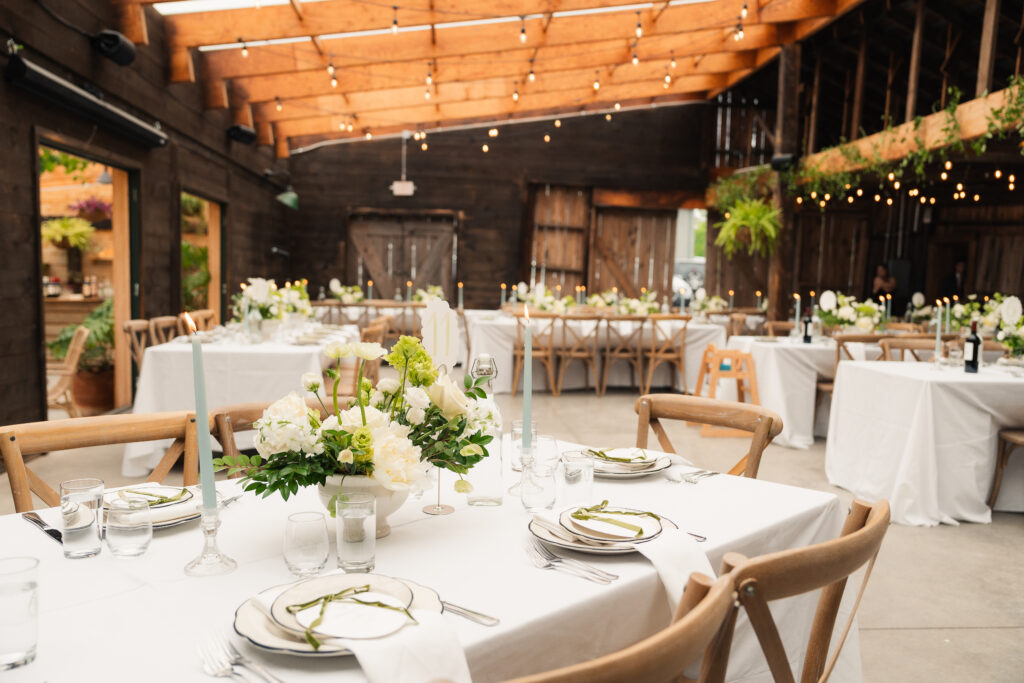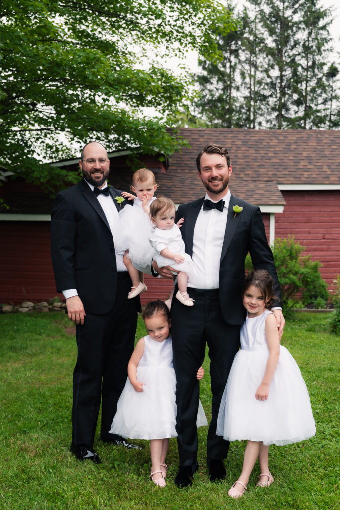 Following the ceremony, the celebration continued under a white tent for cocktail hour, complete with live saxophone music and fresh seafood by the poolside and fire pit area. The reception inside the Arnold House showcased rustic elegance with open wooden beams, hanging greenery, and organic floral décor accented with green velvet bows and soft blue tapered candlesticks. Speeches were heartfelt, and the couple’s unique cheese wheel “cake” added a playful touch to the classy evening. From intimate outdoor details to the cozy, rustic interior, Cat and Mike’s wedding perfectly blended natural charm with timeless sophistication, making it a truly memorable day in upstate New York.