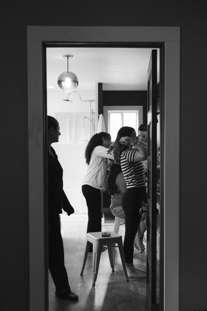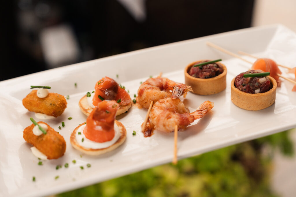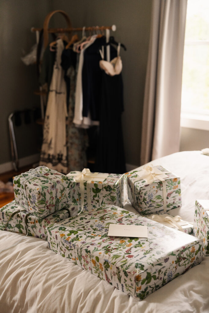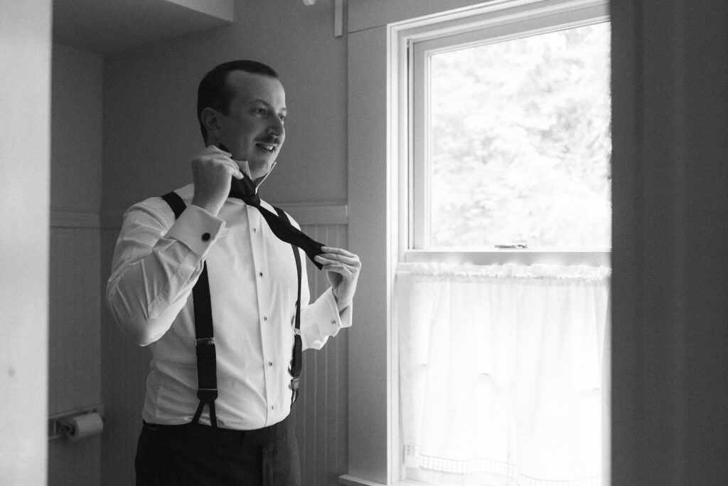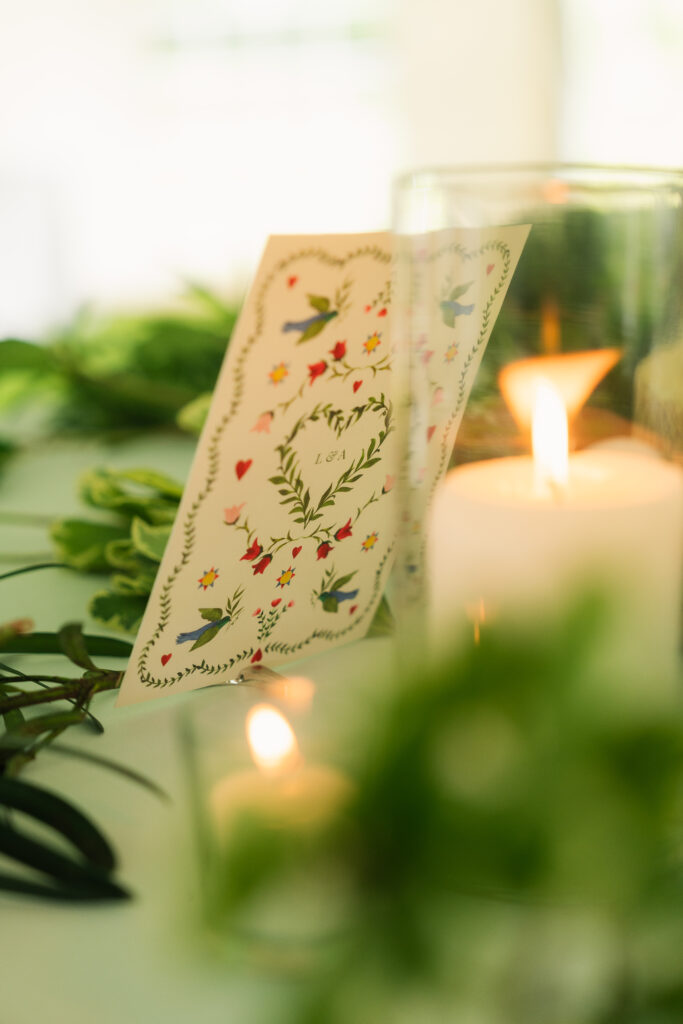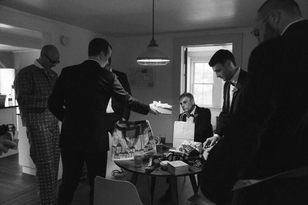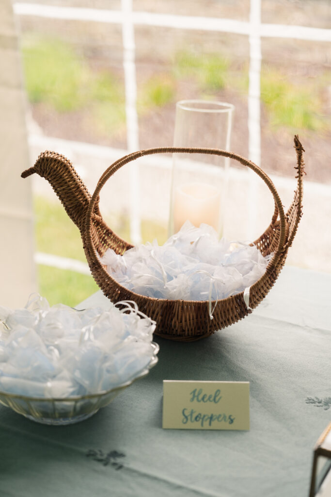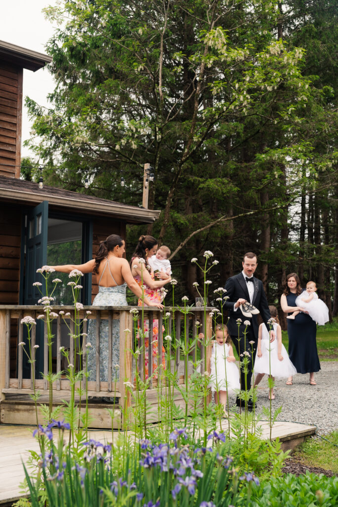 Following the ceremony, the celebration continued under a white tent for cocktail hour, complete with live saxophone music and fresh seafood by the poolside and fire pit area. The reception inside the Arnold House showcased rustic elegance with open wooden beams, hanging greenery, and organic floral décor accented with green velvet bows and soft blue tapered candlesticks. Speeches were heartfelt, and the couple’s unique cheese wheel “cake” added a playful touch to the classy evening. From intimate outdoor details to the cozy, rustic interior, Cat and Mike’s wedding perfectly blended natural charm with timeless sophistication, making it a truly memorable day in upstate New York.