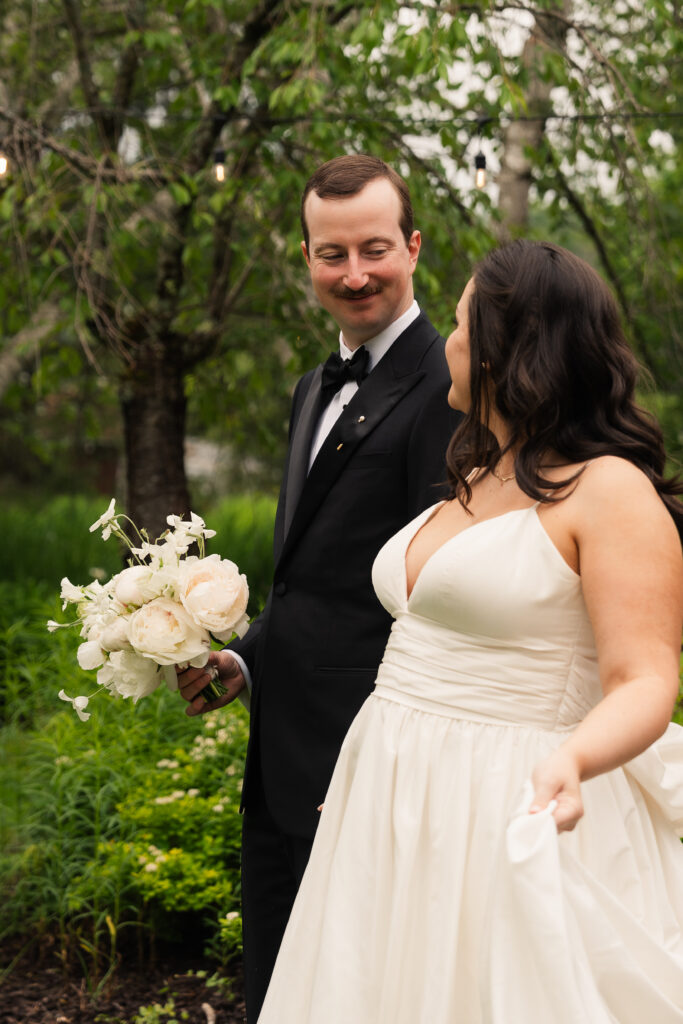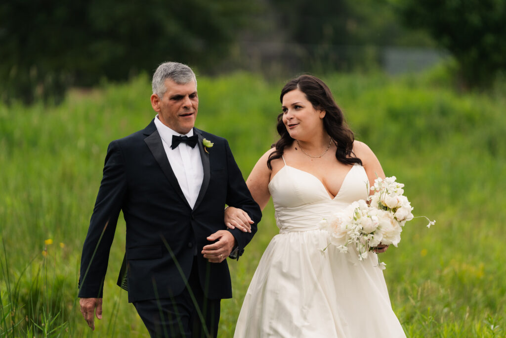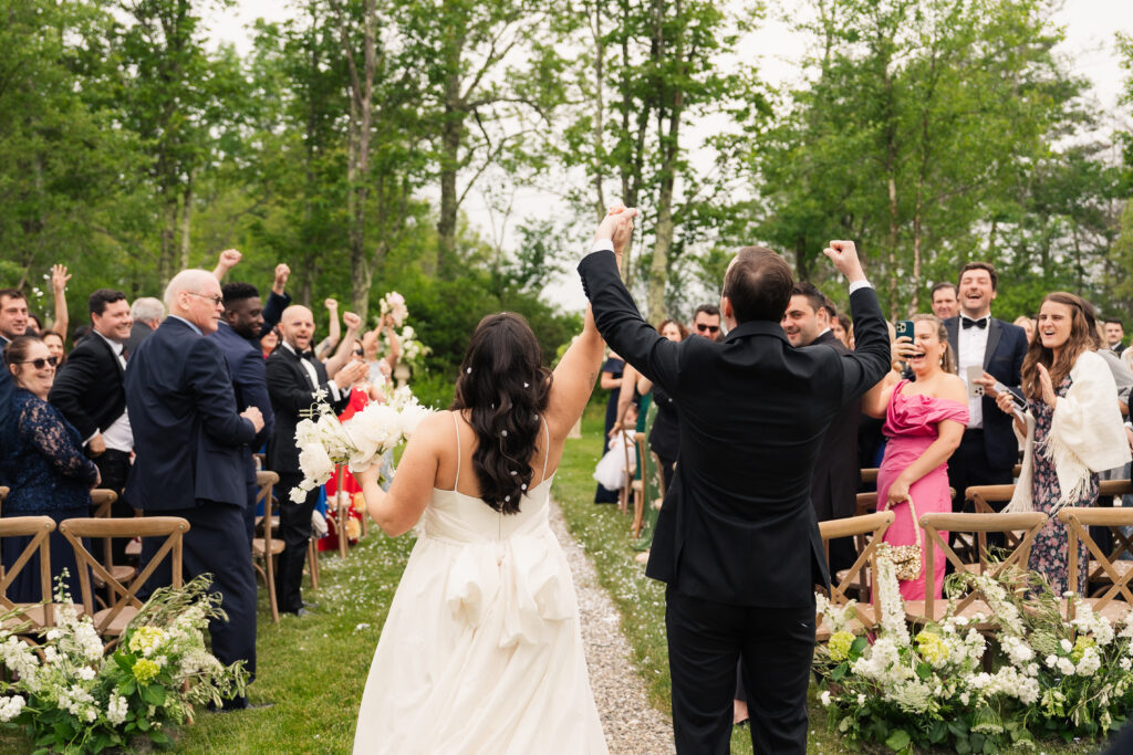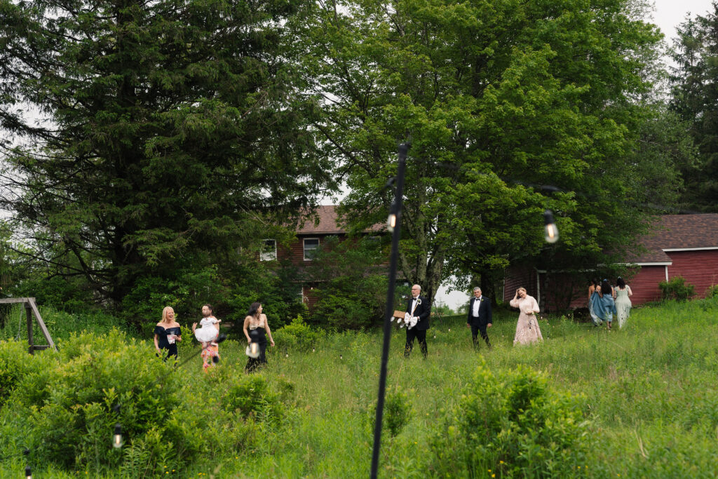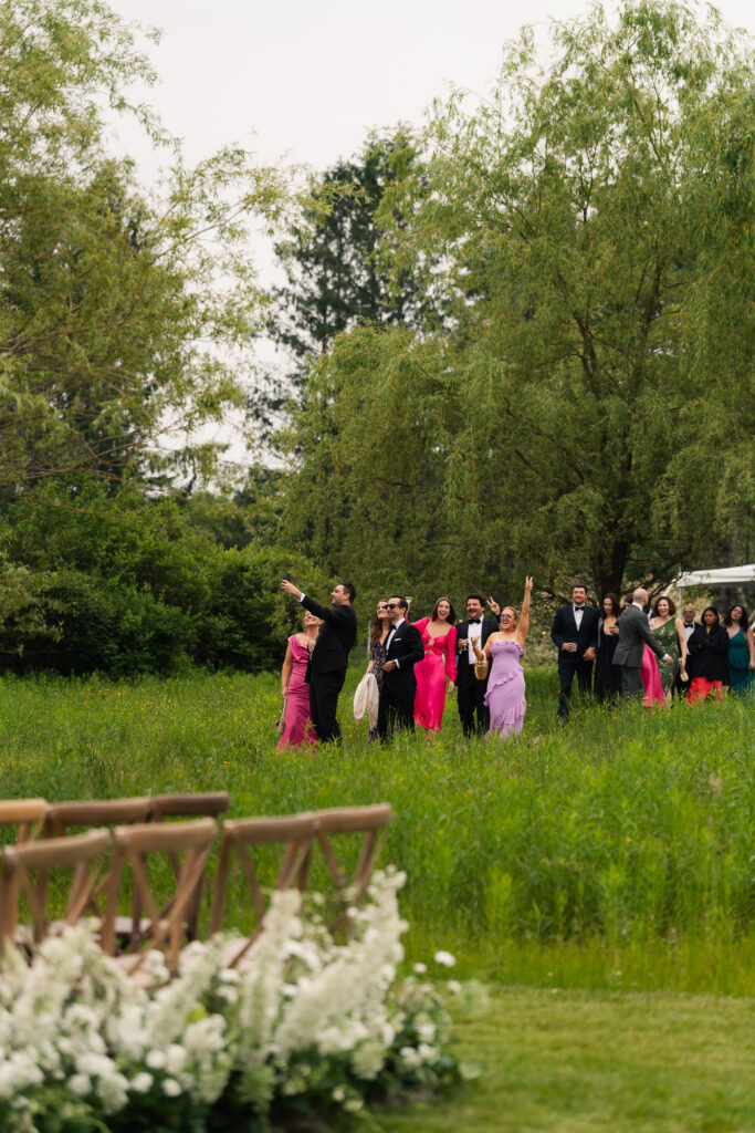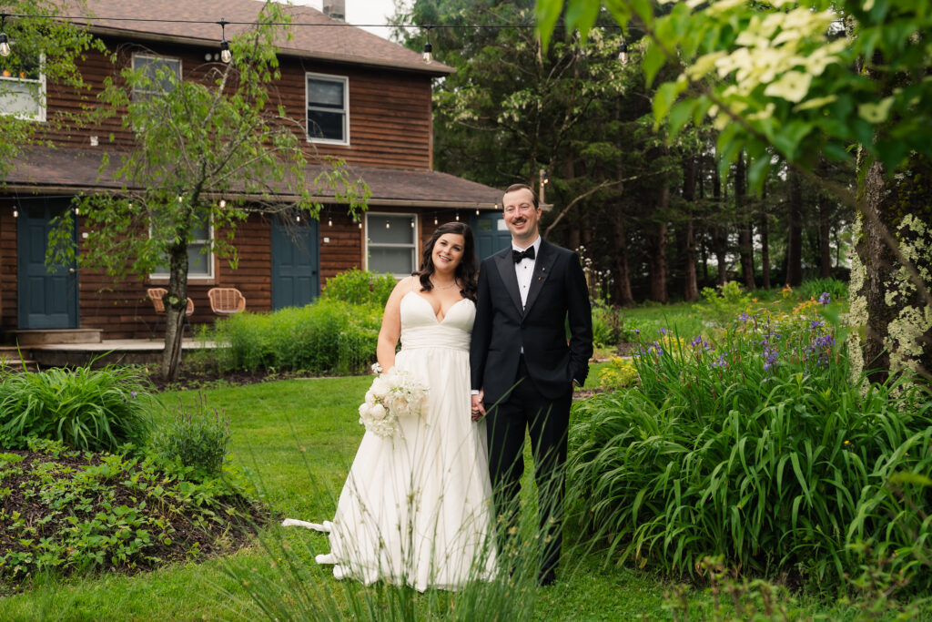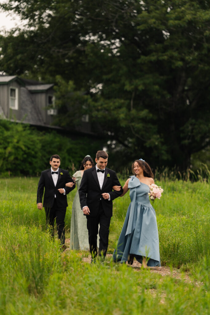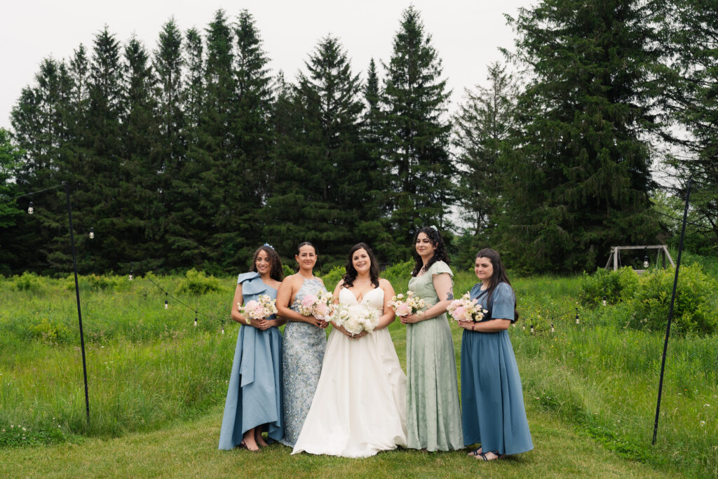 Cat and Mike’s June wedding at the stunning Arnold House in Livingston Manor, New York, was a dreamy celebration full of classic elegance and lush greenery. The day began with a heartfelt first look outside one of the charming guest houses, surrounded by vibrant floral arrangements in soft whites and verdant greens. Cat looked effortlessly timeless in her white crepe dress, while Mike stunned in a black-and-white tuxedo with a bow tie and vintage pin. Their bridal party wore soft pastel tones that perfectly complemented the floral-focused design. Guests walked through a scenic meadow to reach the outdoor ceremony, where handwritten vows, emotional laughter, and petal tosses created magical, unforgettable moments.