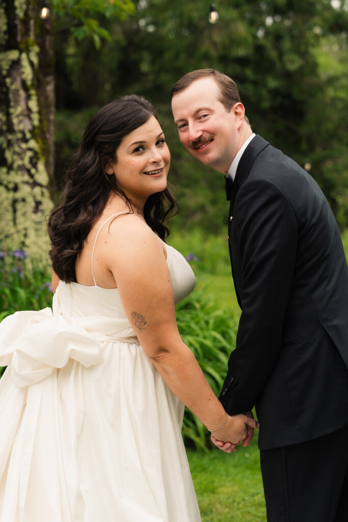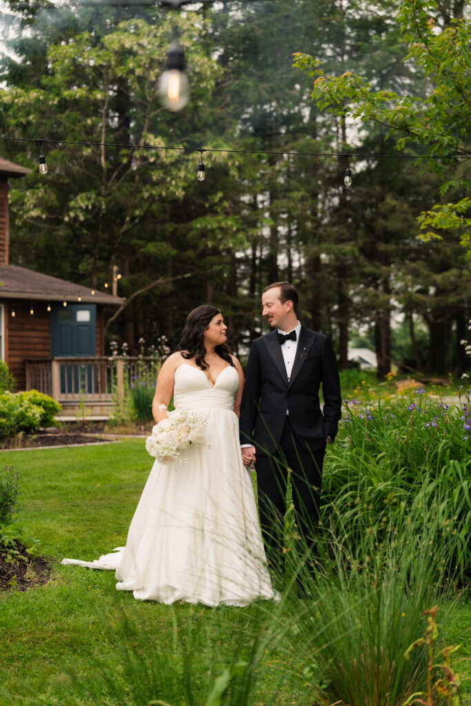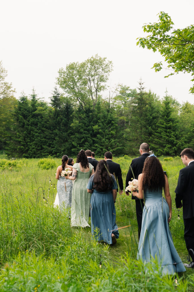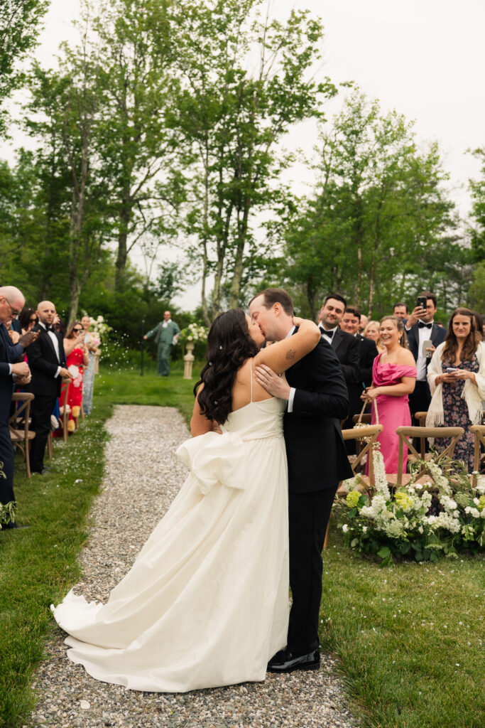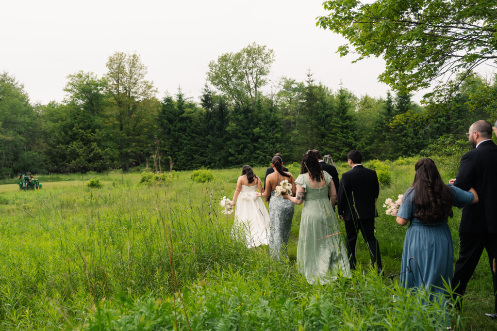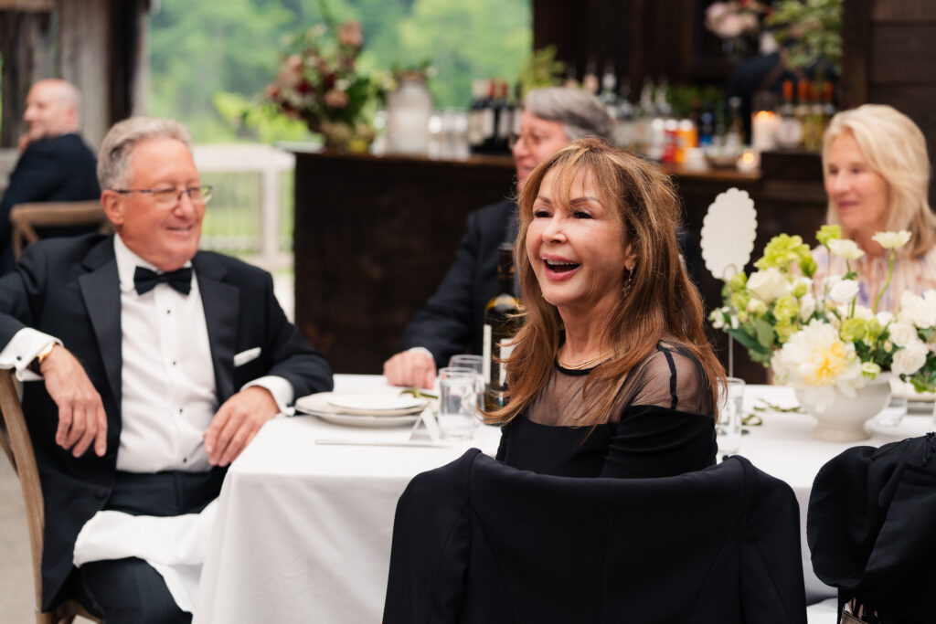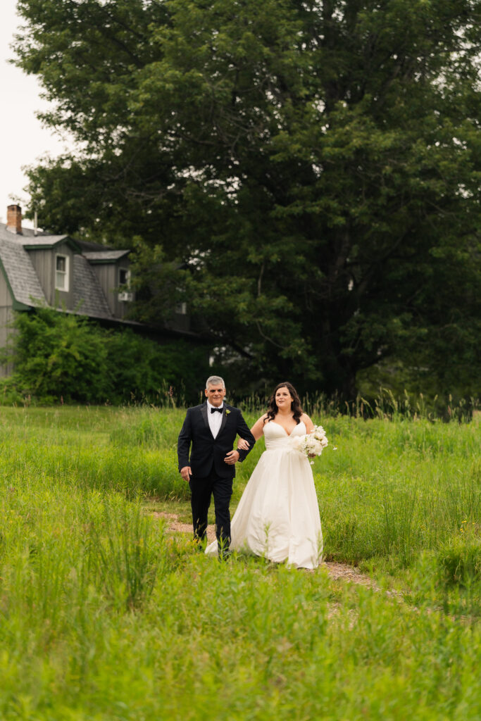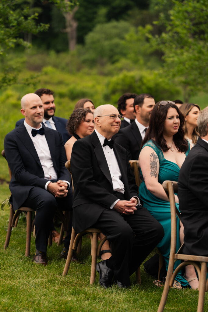 Cat and Mike’s June wedding at the stunning Arnold House in Livingston Manor, New York, was a dreamy celebration full of classic elegance and lush greenery. The day began with a heartfelt first look outside one of the charming guest houses, surrounded by vibrant floral arrangements in soft whites and verdant greens. Cat looked effortlessly timeless in her white crepe dress, while Mike stunned in a black-and-white tuxedo with a bow tie and vintage pin. Their bridal party wore soft pastel tones that perfectly complemented the floral-focused design. Guests walked through a scenic meadow to reach the outdoor ceremony, where handwritten vows, emotional laughter, and petal tosses created magical, unforgettable moments.