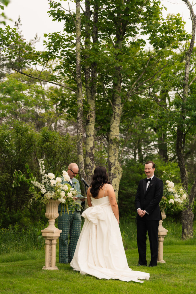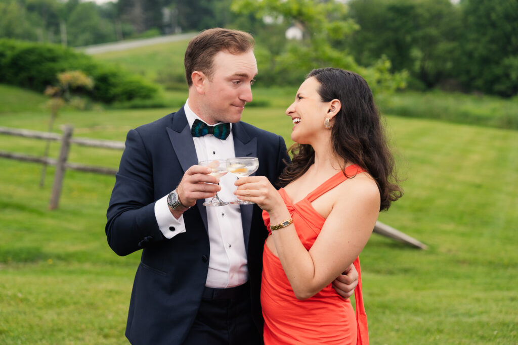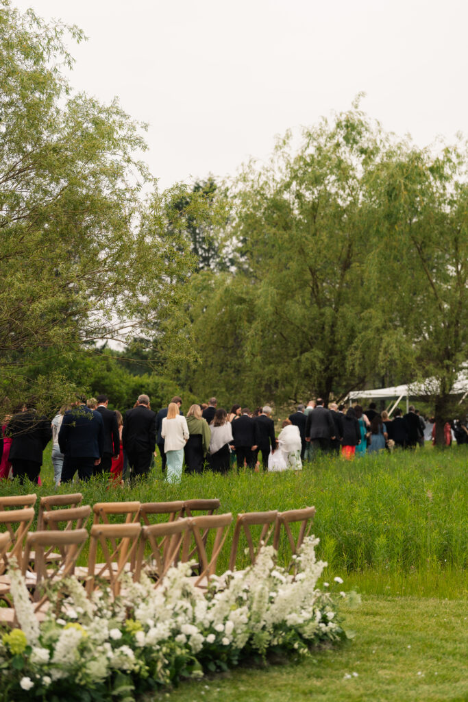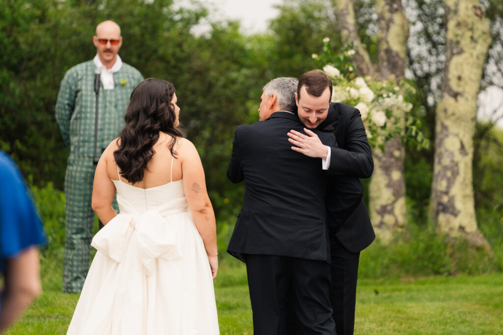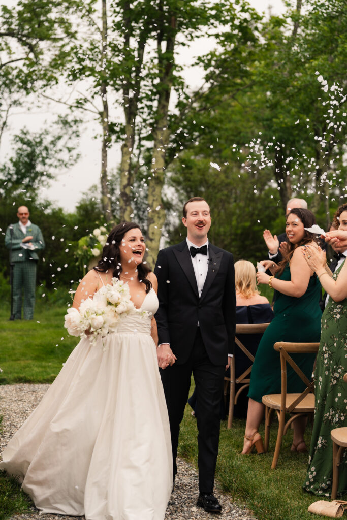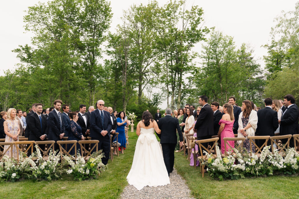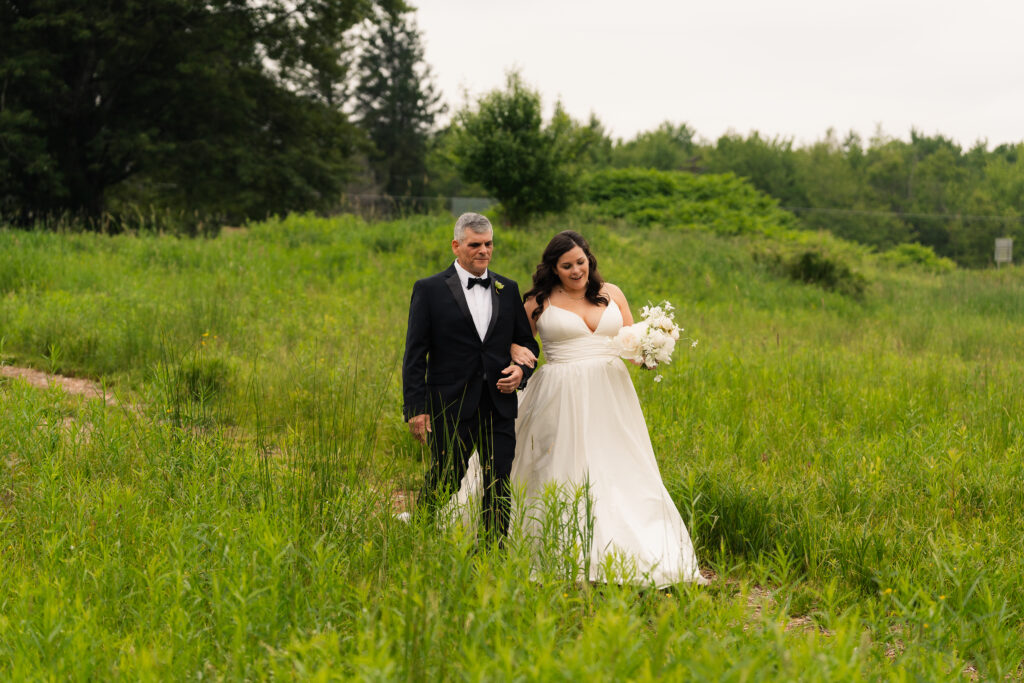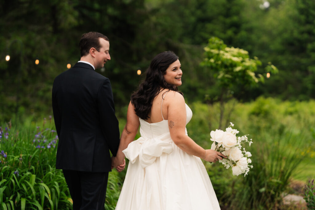 Cat and Mike’s June wedding at the stunning Arnold House in Livingston Manor, New York, was a dreamy celebration full of classic elegance and lush greenery. The day began with a heartfelt first look outside one of the charming guest houses, surrounded by vibrant floral arrangements in soft whites and verdant greens. Cat looked effortlessly timeless in her white crepe dress, while Mike stunned in a black-and-white tuxedo with a bow tie and vintage pin. Their bridal party wore soft pastel tones that perfectly complemented the floral-focused design. Guests walked through a scenic meadow to reach the outdoor ceremony, where handwritten vows, emotional laughter, and petal tosses created magical, unforgettable moments.