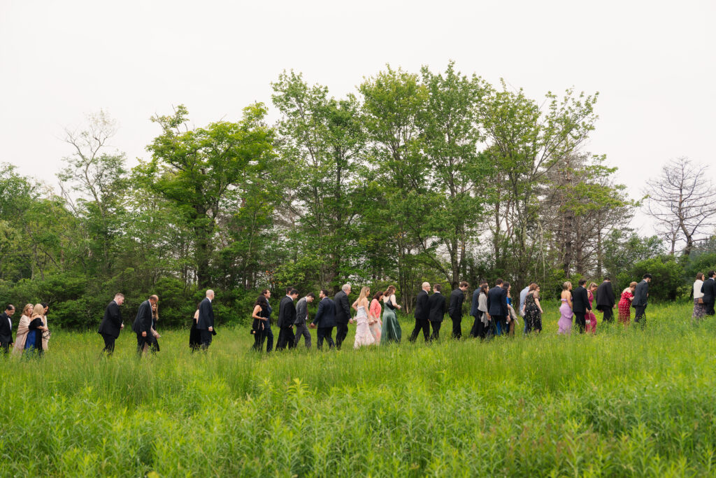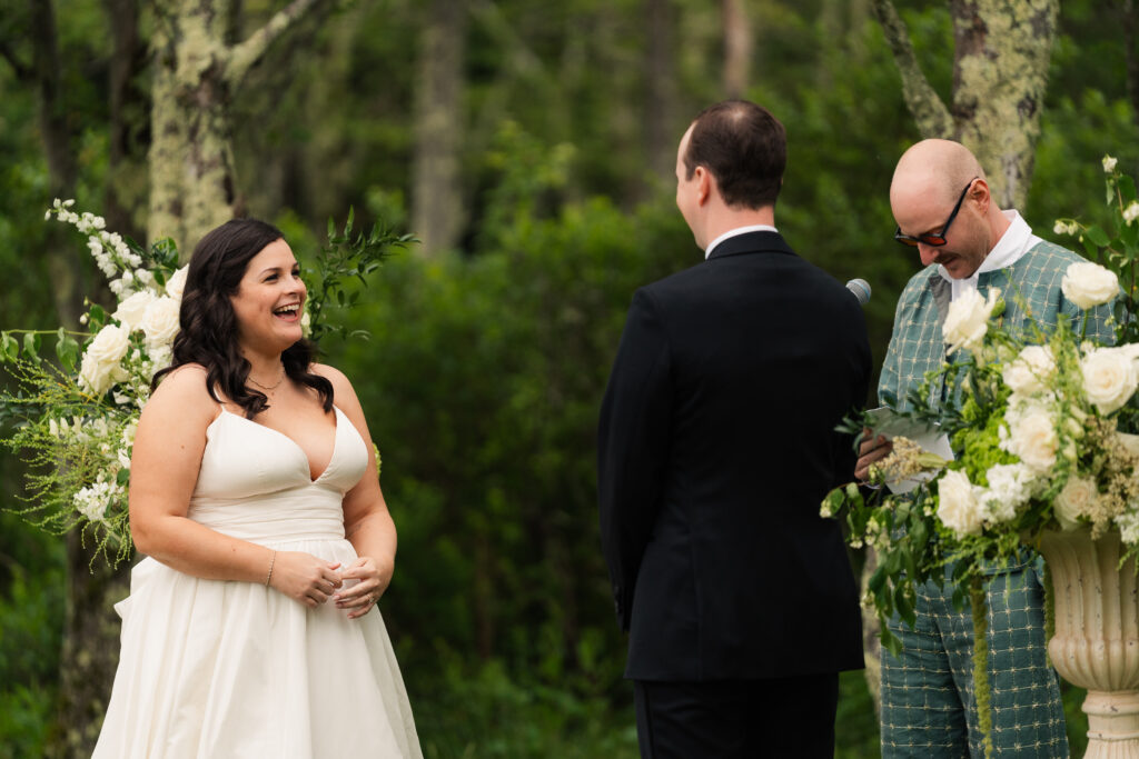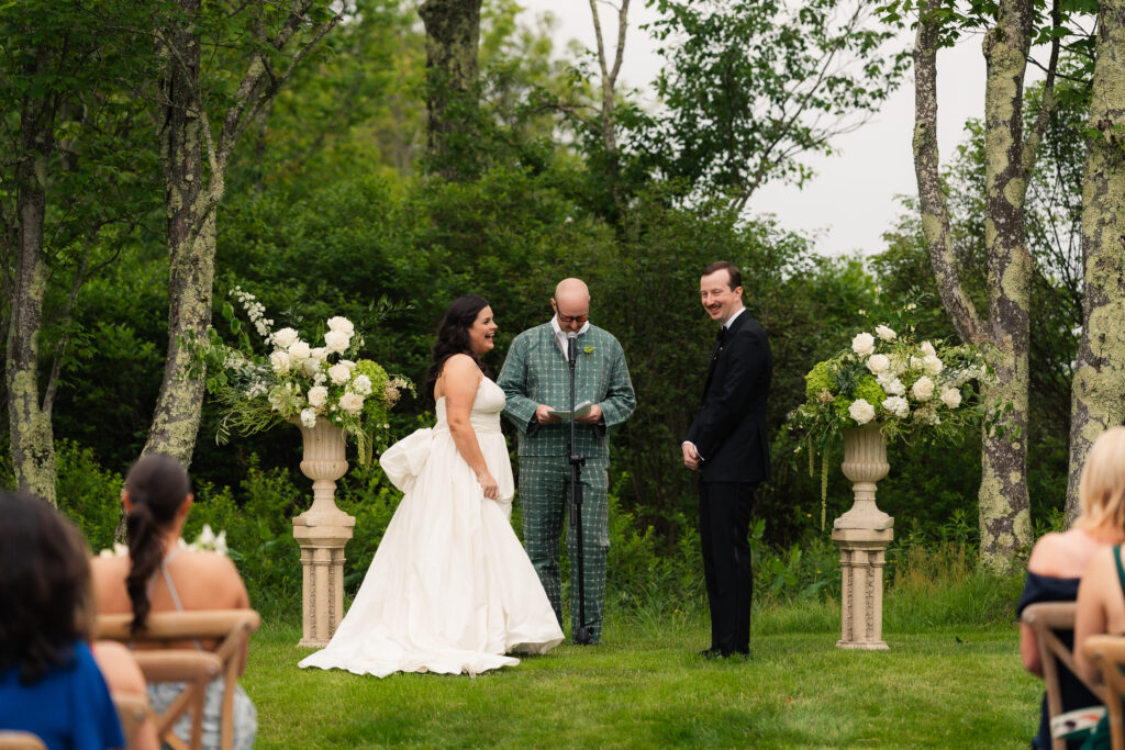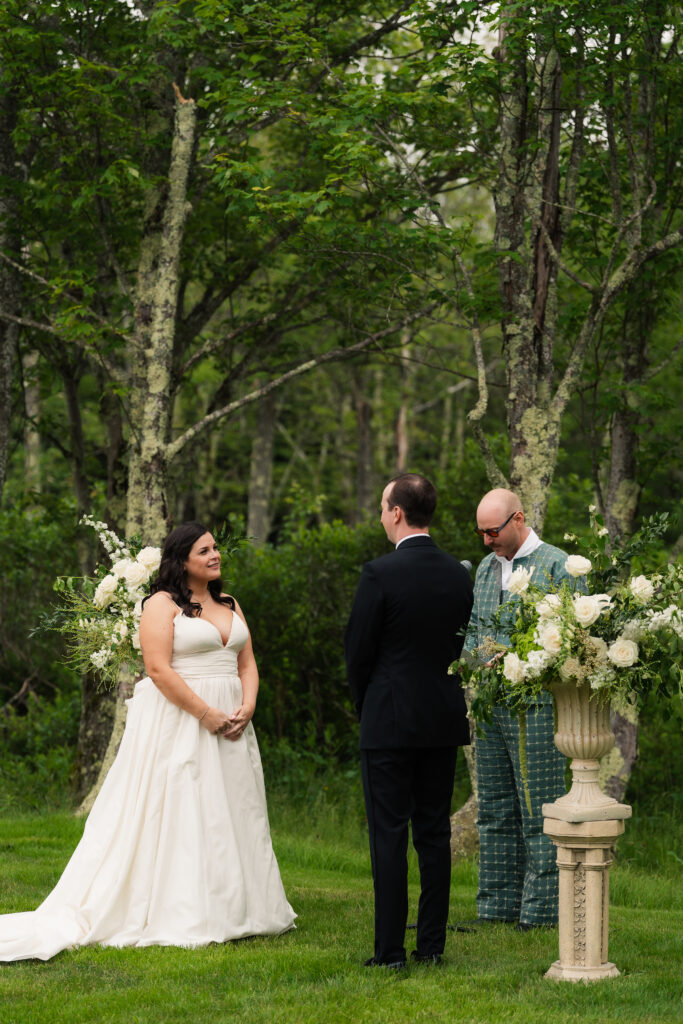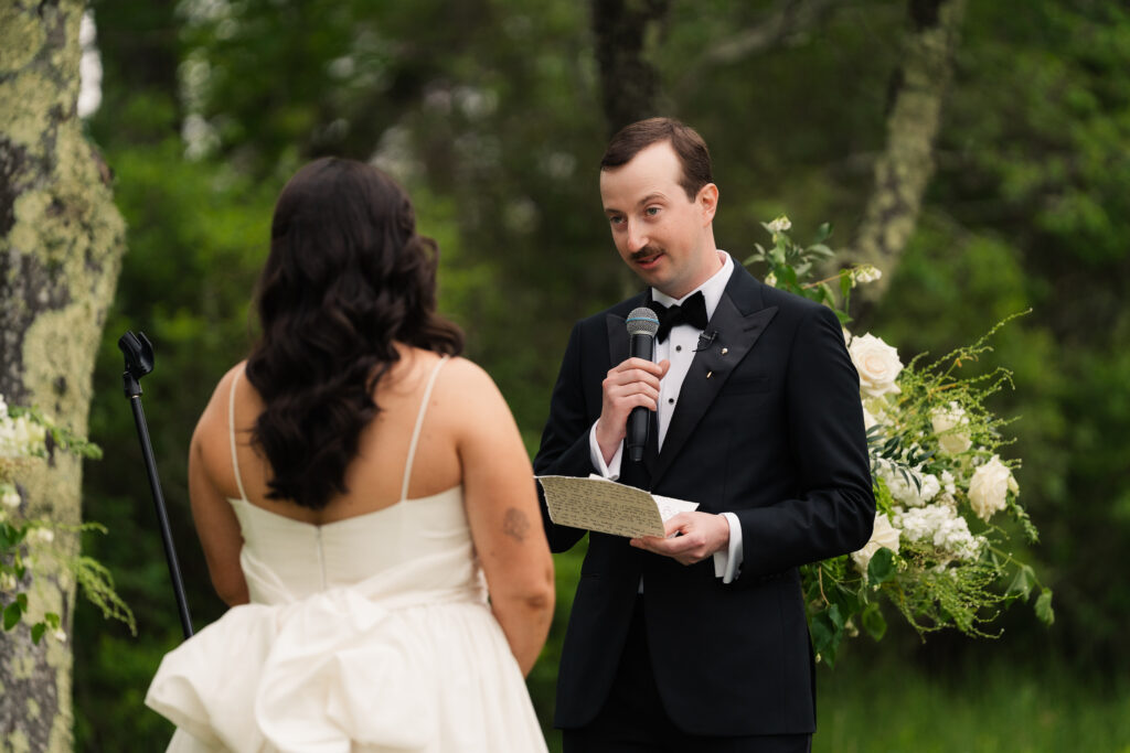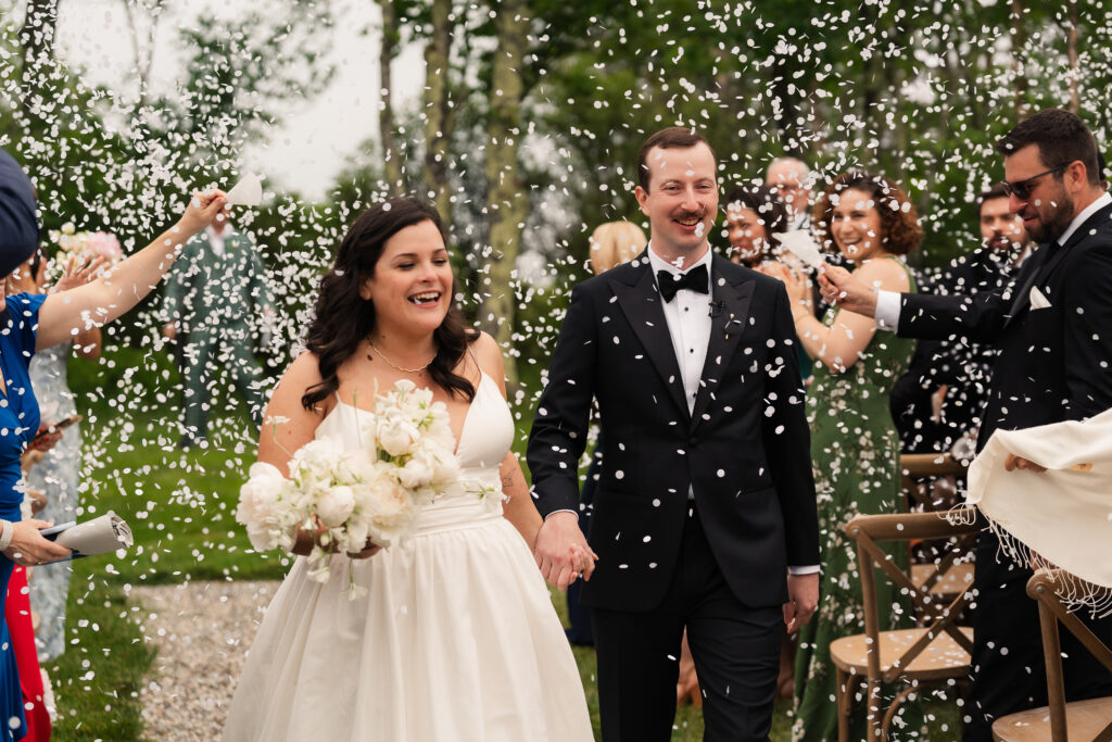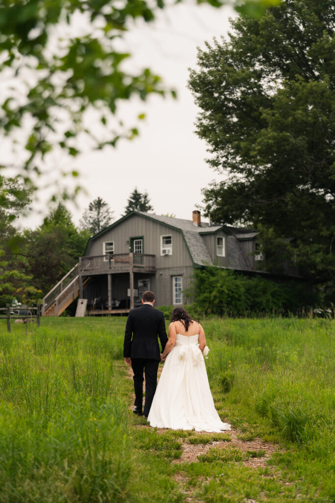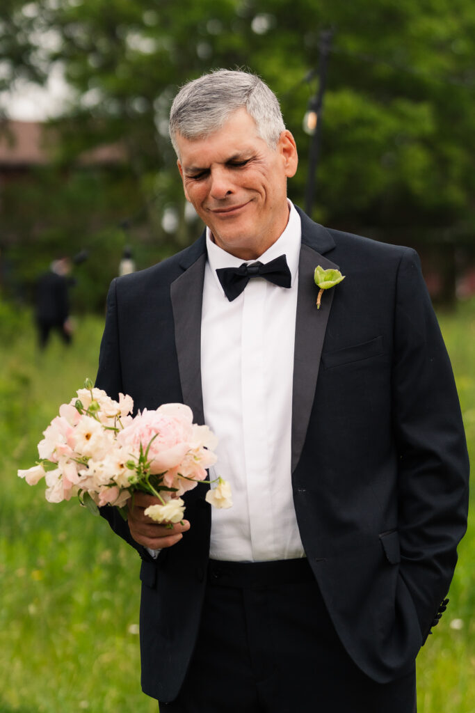 Cat and Mike’s June wedding at the stunning Arnold House in Livingston Manor, New York, was a dreamy celebration full of classic elegance and lush greenery. The day began with a heartfelt first look outside one of the charming guest houses, surrounded by vibrant floral arrangements in soft whites and verdant greens. Cat looked effortlessly timeless in her white crepe dress, while Mike stunned in a black-and-white tuxedo with a bow tie and vintage pin. Their bridal party wore soft pastel tones that perfectly complemented the floral-focused design. Guests walked through a scenic meadow to reach the outdoor ceremony, where handwritten vows, emotional laughter, and petal tosses created magical, unforgettable moments.