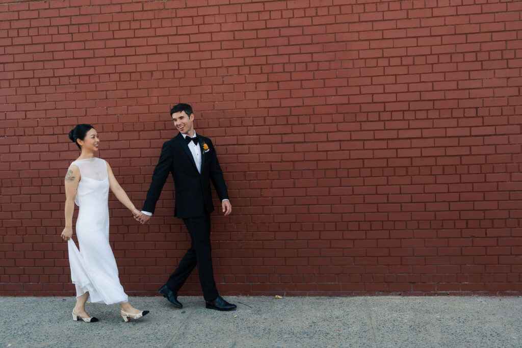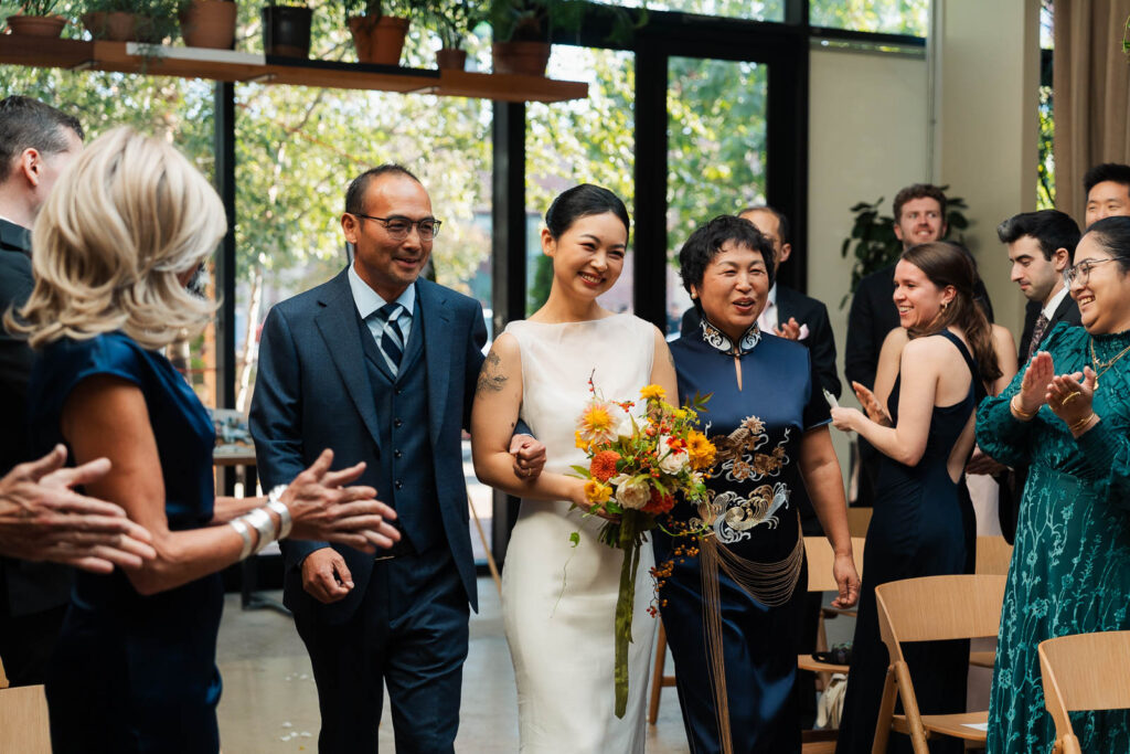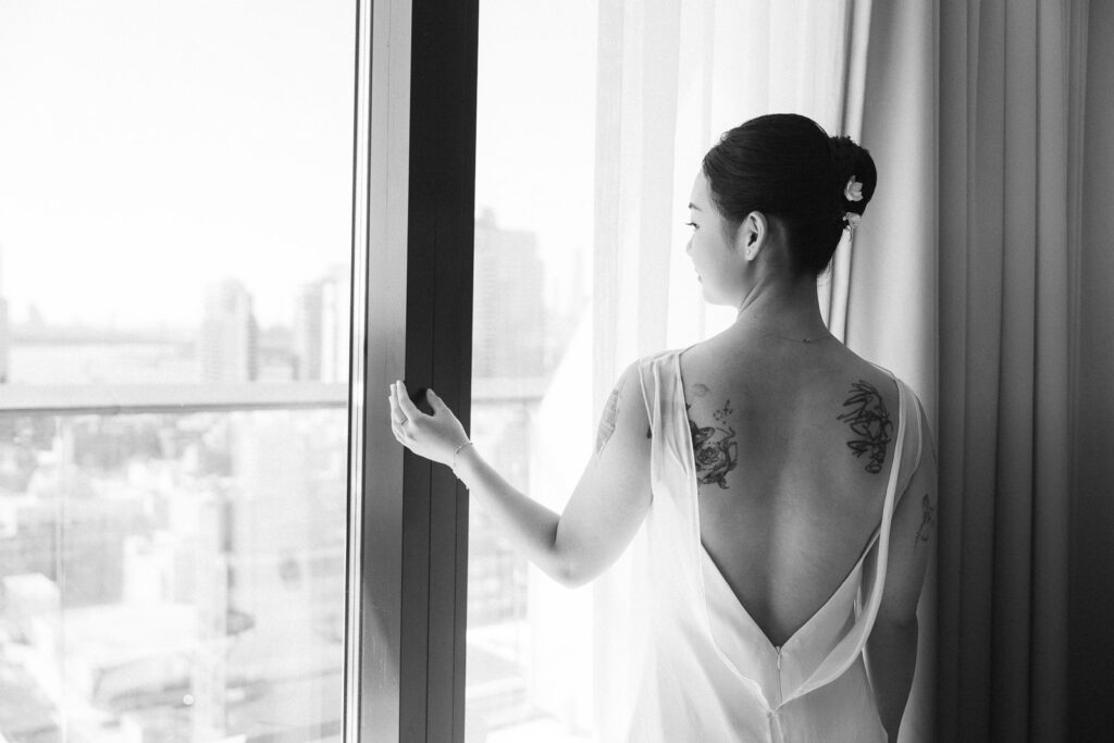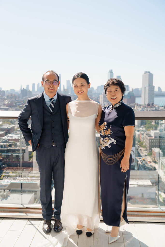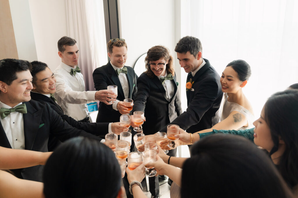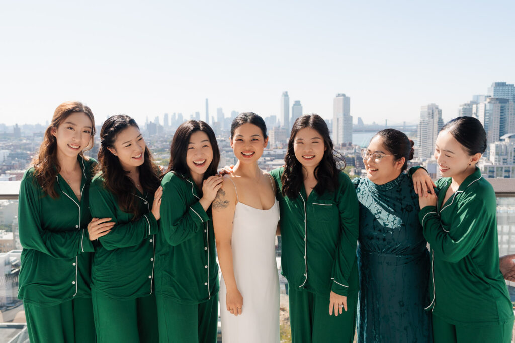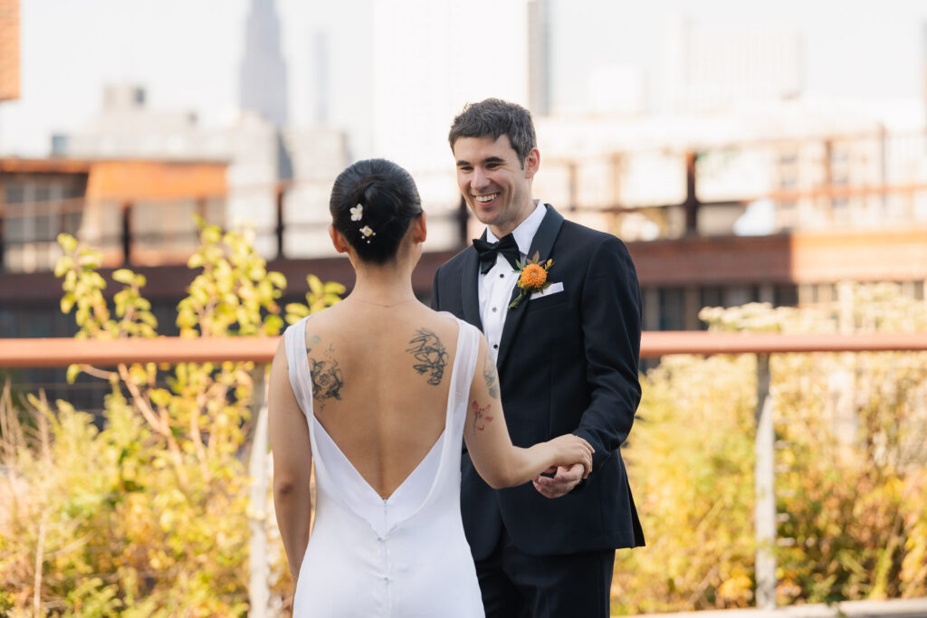Starting the day off at The William Vale, Ziyu set a laid-back effortless atmosphere with delicious salads and a few handfuls of Polaroids. Her makeup, hair, and bridal gown all conveyed effortless, chic style with a beautiful bun, natural makeup, and a unique Lola Varma gown.  Her parents who traveled internationally, got to see their daughter on her wedding day. There wasn’t a dry eye in the room overlooking the New York skyline. Alex got ready with the Empire State Building in the background of their rooftop apartment. After a very eventful subway ride, Ziyu and Alex got to share their first look at the William Vale greenery area. Finally together, they had a celebratory champagne toast with their wedding party before walking to their venue, Rule of Thirds.