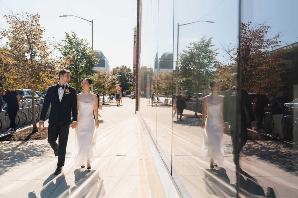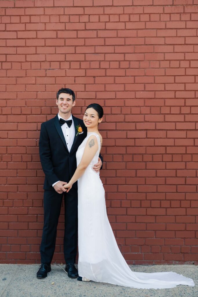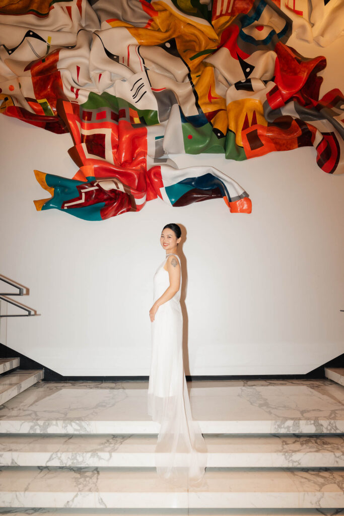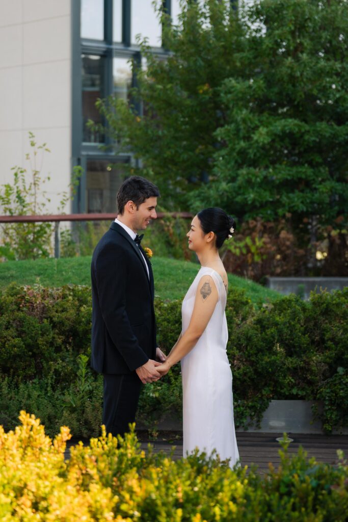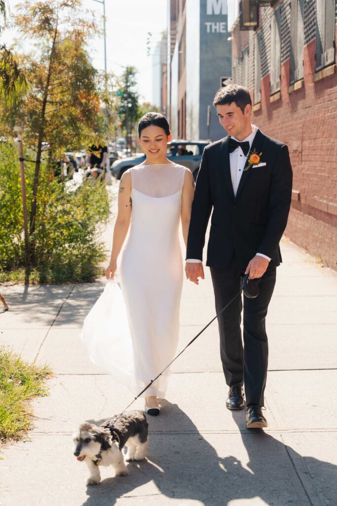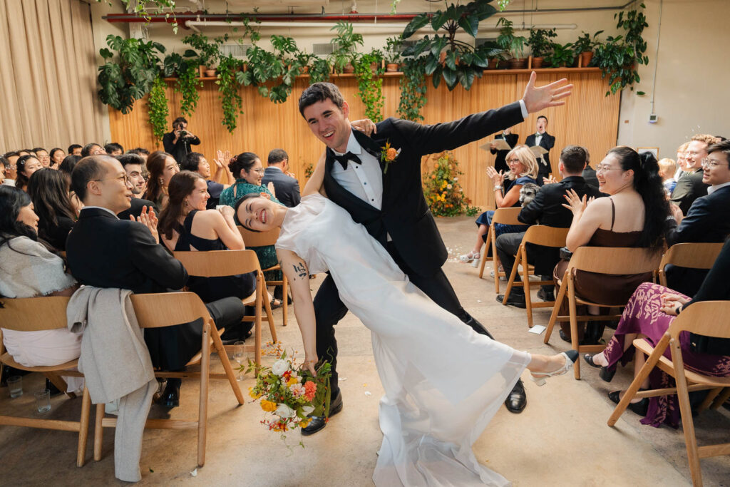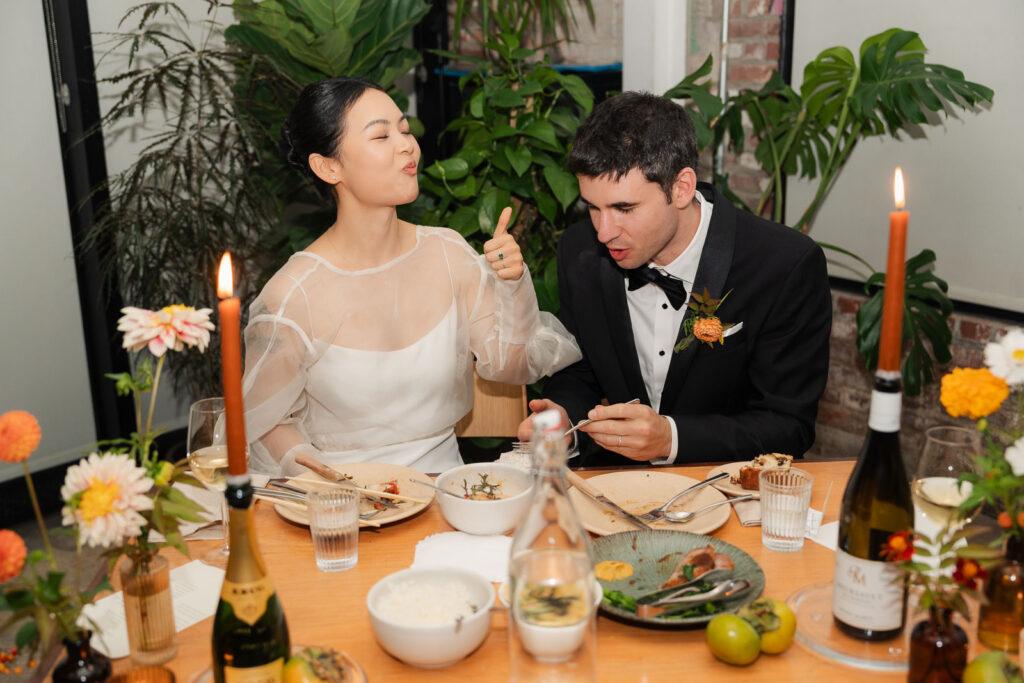 Starting the day off at The William Vale, Ziyu set a laid-back effortless atmosphere with delicious salads and a few handfuls of Polaroids. Her makeup, hair, and bridal gown all conveyed effortless, chic style with a beautiful bun, natural makeup, and a unique Lola Varma gown.  Her parents who traveled internationally, got to see their daughter on her wedding day. There wasn’t a dry eye in the room overlooking the New York skyline. Alex got ready with the Empire State Building in the background of their rooftop apartment. After a very eventful subway ride, Ziyu and Alex got to share their first look at the William Vale greenery area. Finally together, they had a celebratory champagne toast with their wedding party before walking to their venue, Rule of Thirds.