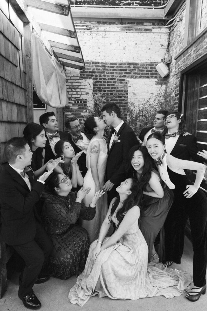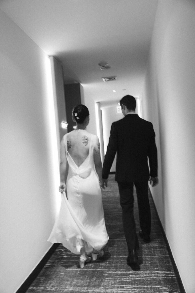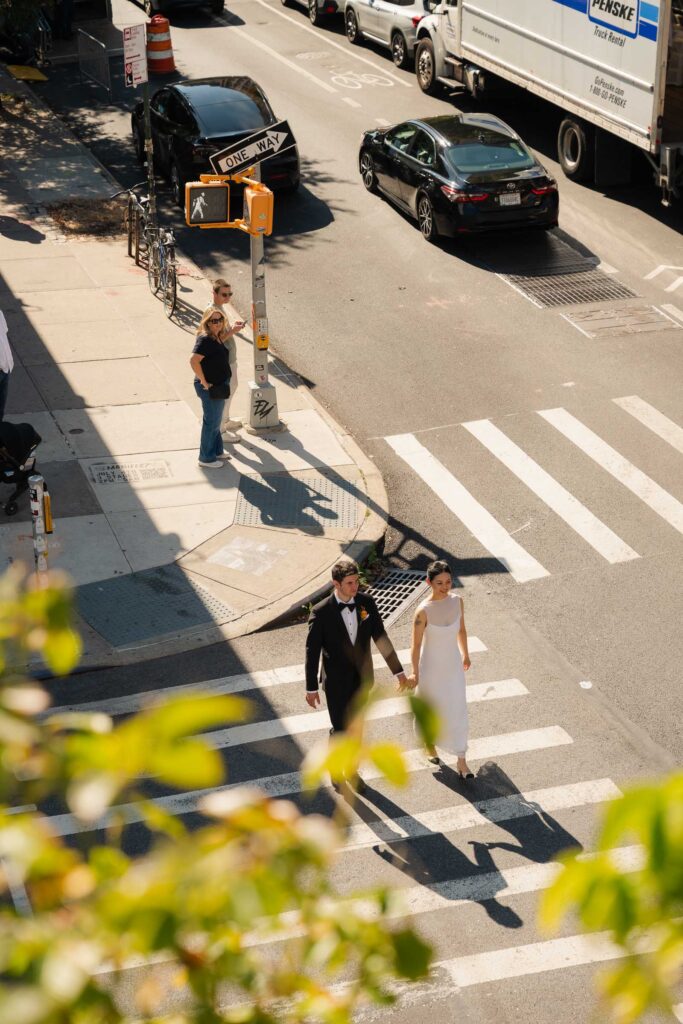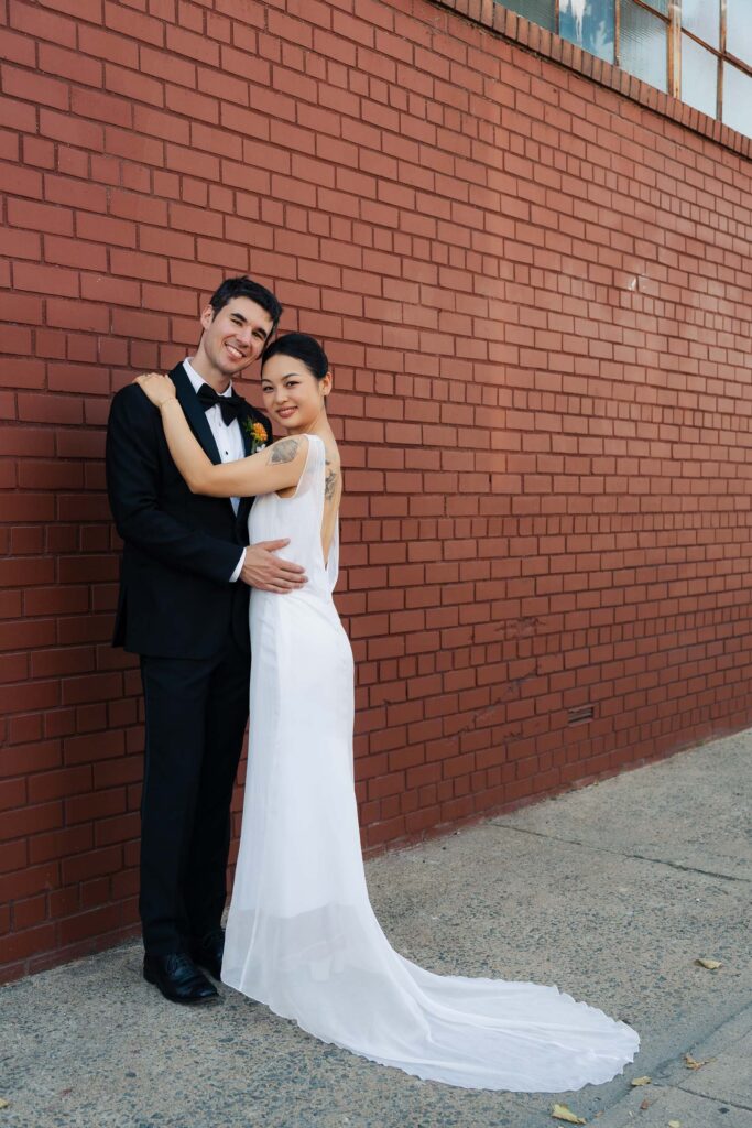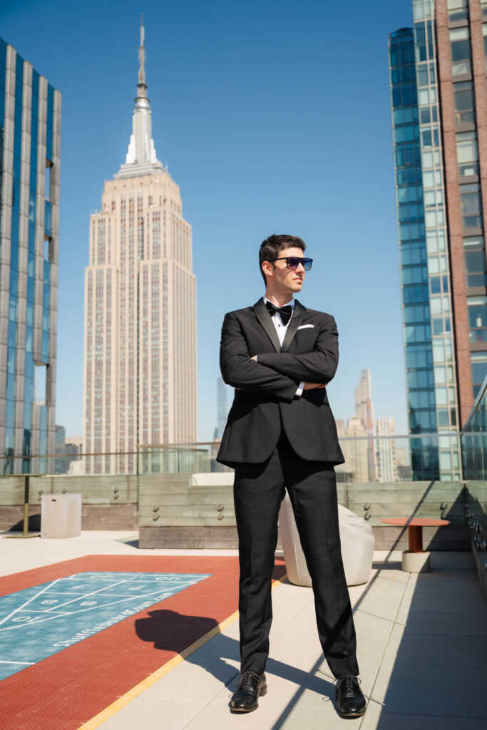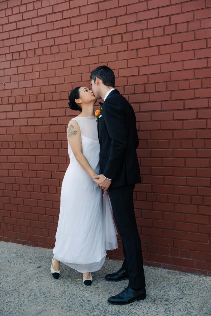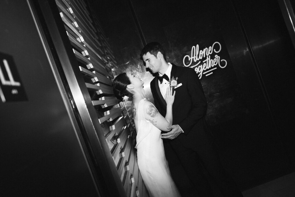 Starting the day off at The William Vale, Ziyu set a laid-back effortless atmosphere with delicious salads and a few handfuls of Polaroids. Her makeup, hair, and bridal gown all conveyed effortless, chic style with a beautiful bun, natural makeup, and a unique Lola Varma gown.  Her parents who traveled internationally, got to see their daughter on her wedding day. There wasn’t a dry eye in the room overlooking the New York skyline. Alex got ready with the Empire State Building in the background of their rooftop apartment. After a very eventful subway ride, Ziyu and Alex got to share their first look at the William Vale greenery area. Finally together, they had a celebratory champagne toast with their wedding party before walking to their venue, Rule of Thirds.