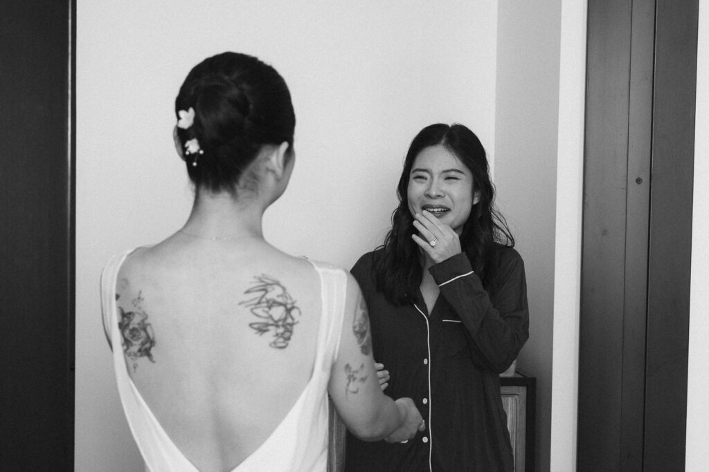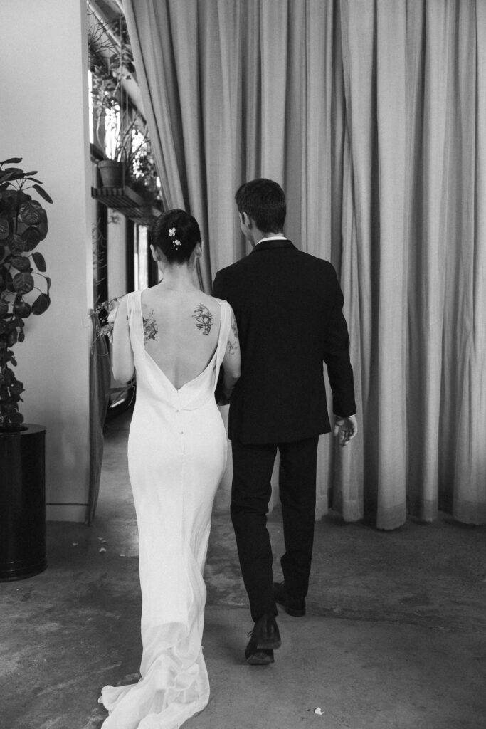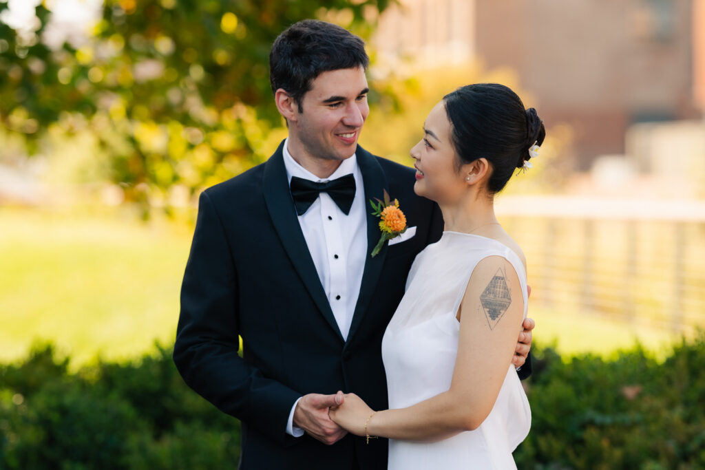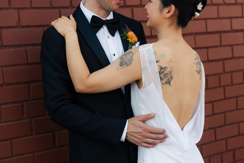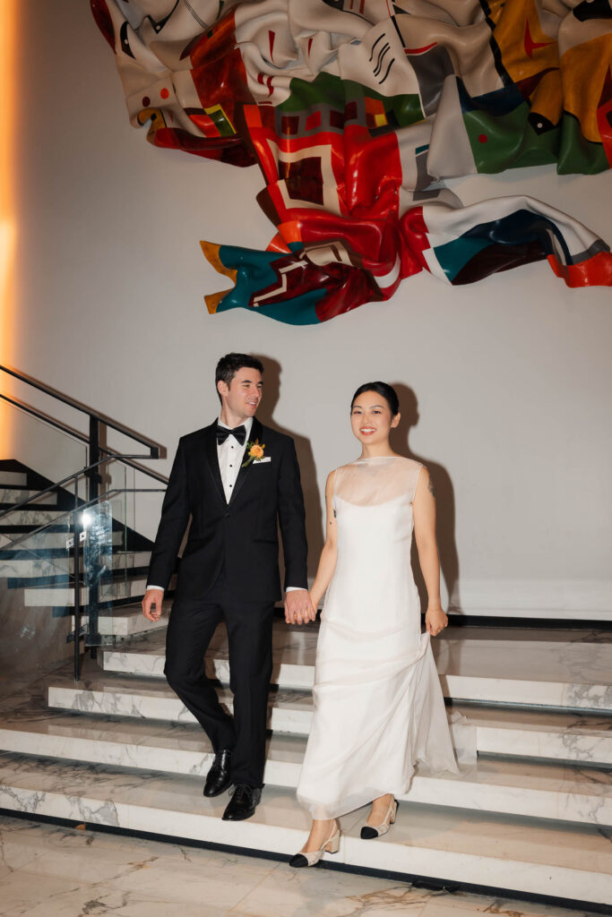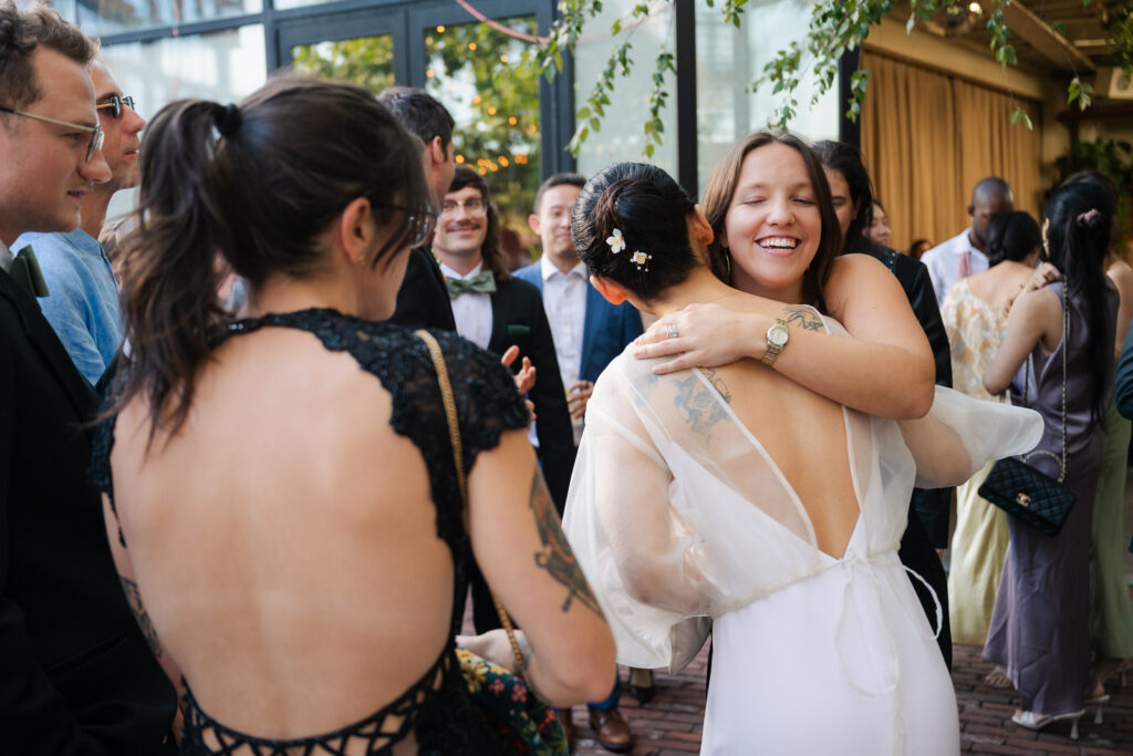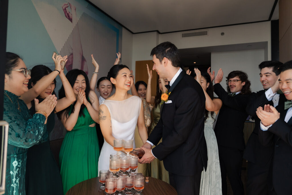 Starting the day off at The William Vale, Ziyu set a laid-back effortless atmosphere with delicious salads and a few handfuls of Polaroids. Her makeup, hair, and bridal gown all conveyed effortless, chic style with a beautiful bun, natural makeup, and a unique Lola Varma gown.  Her parents who traveled internationally, got to see their daughter on her wedding day. There wasn’t a dry eye in the room overlooking the New York skyline. Alex got ready with the Empire State Building in the background of their rooftop apartment. After a very eventful subway ride, Ziyu and Alex got to share their first look at the William Vale greenery area. Finally together, they had a celebratory champagne toast with their wedding party before walking to their venue, Rule of Thirds.