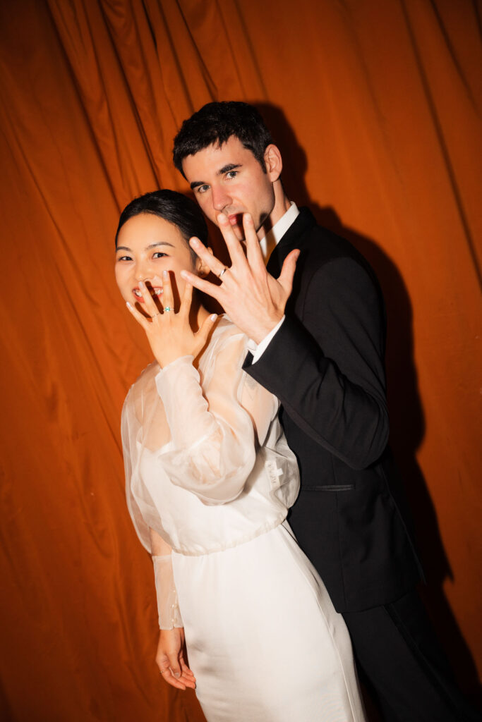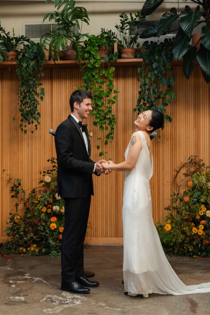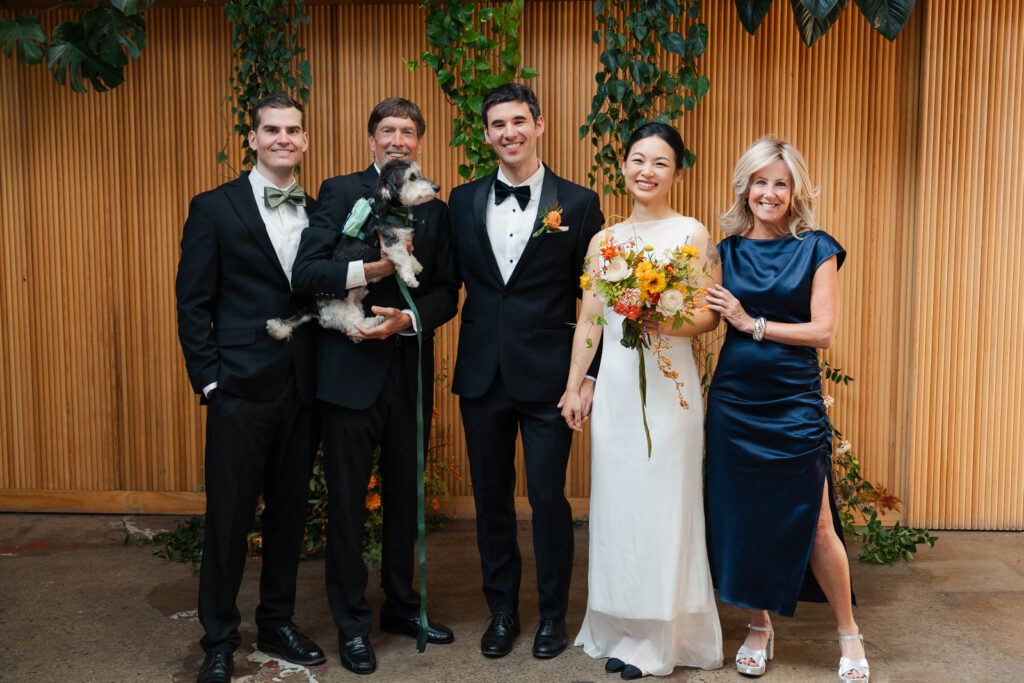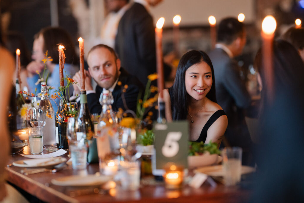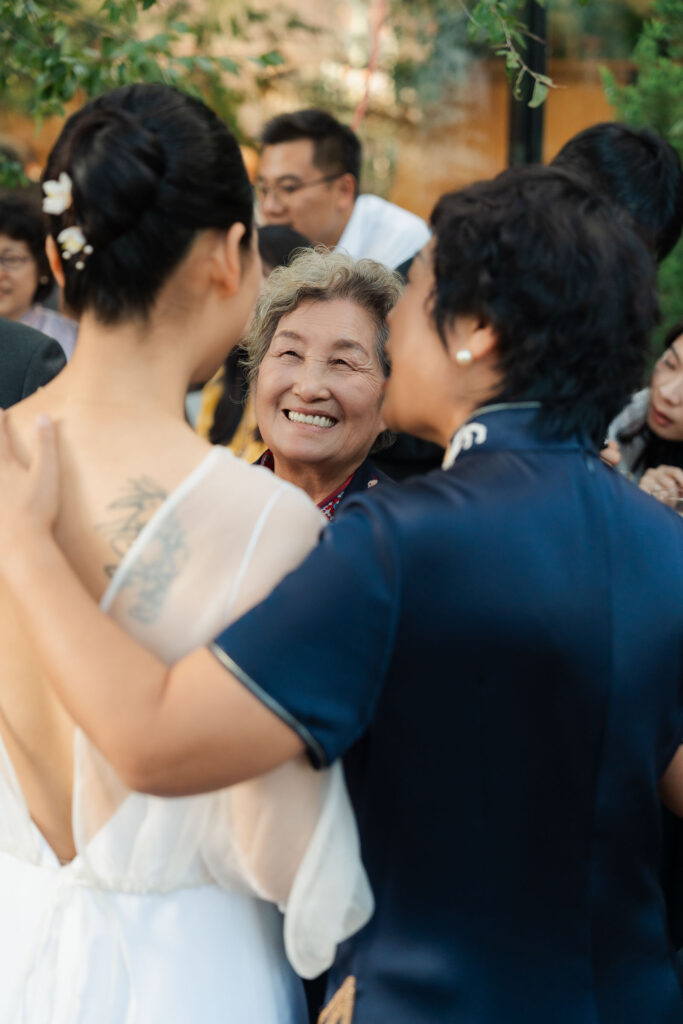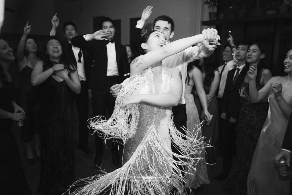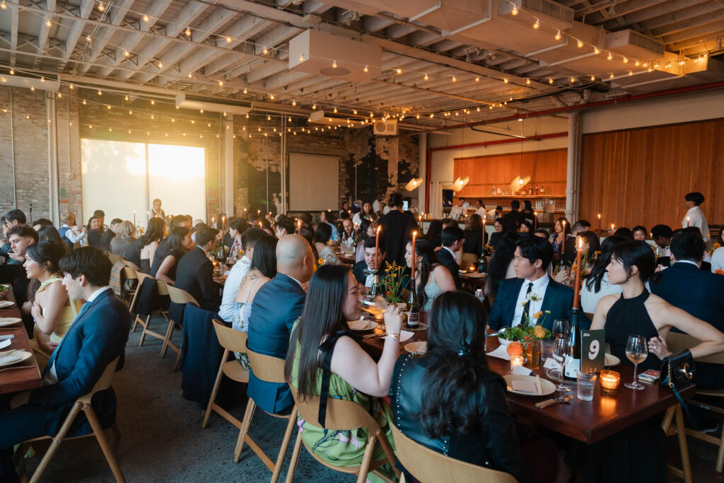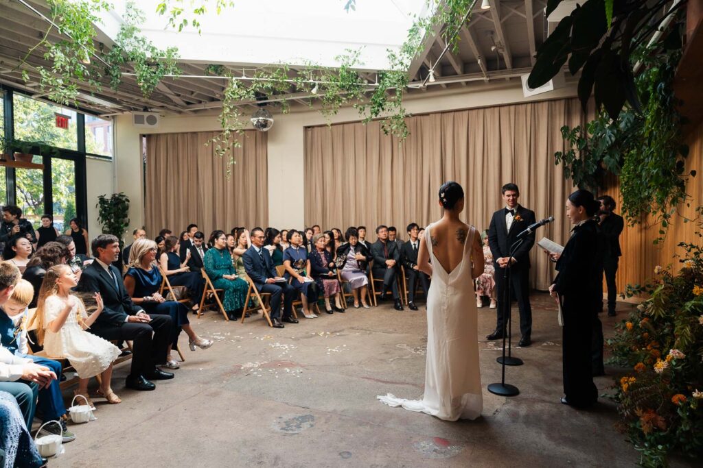Their wedding ceremony was so emotional. Alex’s emotions were already swelling at the sight of all their family and friends from near and far gathered in the naturally lit greenery filled space. Alex cried as Ziyu walked down the aisle. Holding his hands over his chest as if his heart would explode at the sight of his bride, everyone else started to cry at his reaction. When the heartfelt vows were exchanged and the ceremony had ended, a full blown celebration was in store. Golden hour light filled cocktail hour outside as the candle lit reception space was decorated. Ziyu and Alex had collected all the empty wine bottles shared with family and friends during their engagement journey. Those bottles were then noted with who they shared it with and the date. Guests were overcome with gratitude as they found those bottles as reception decor, a reminder that they were valued in their lives. The speeches were SO funny. They brought everyone to tears to deep belly laughing back to tears.  The rest of the evening consisted of Ziyu and Alex showcasing their ballroom dance skills with their electric first dance, two outfit changes, bread cutting (instead of cake), and disco ball lit dancing!