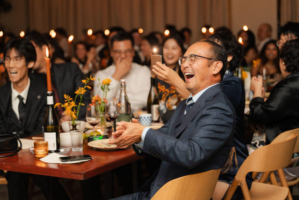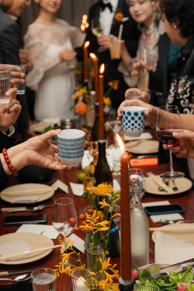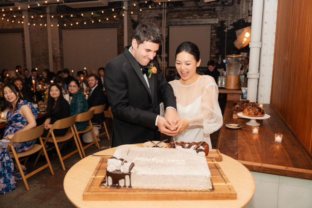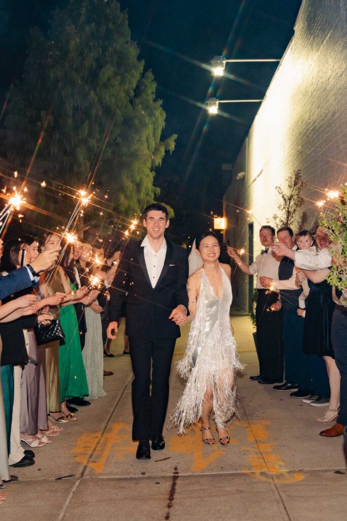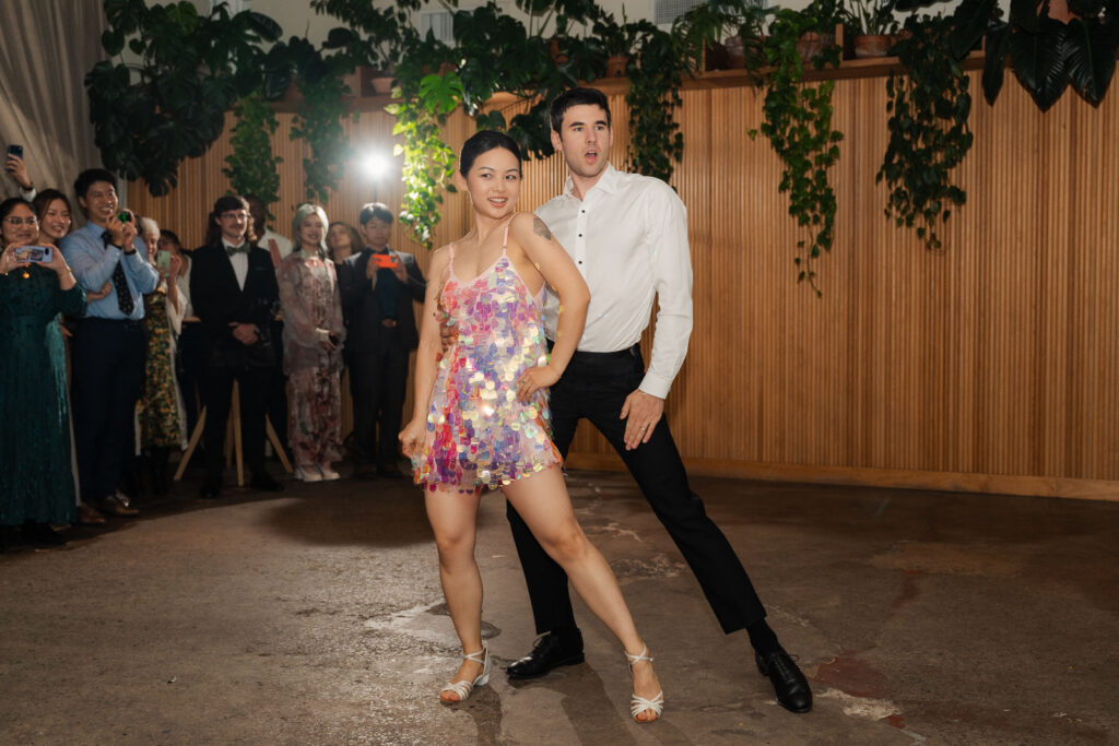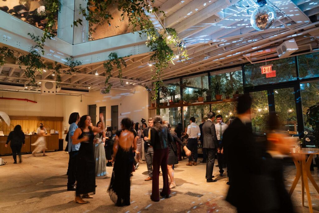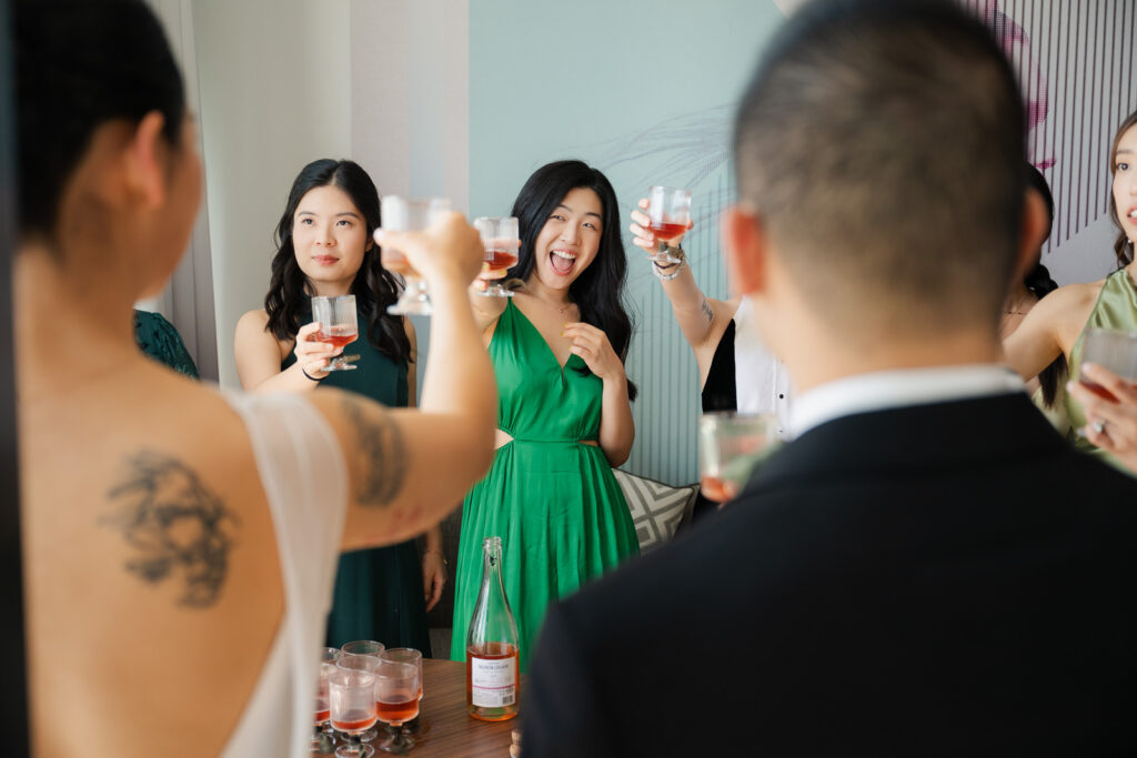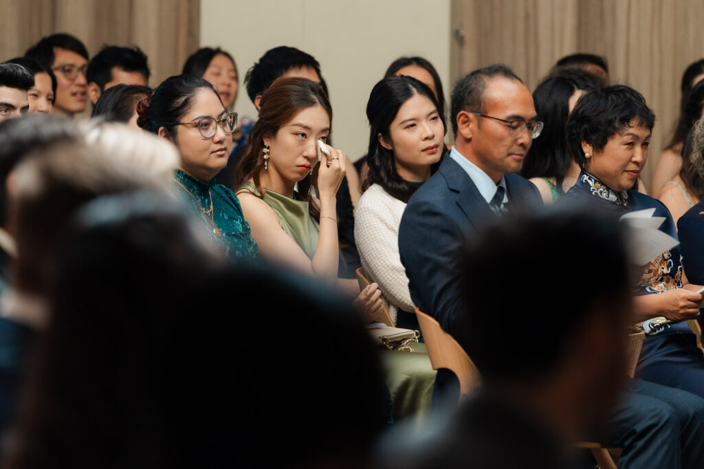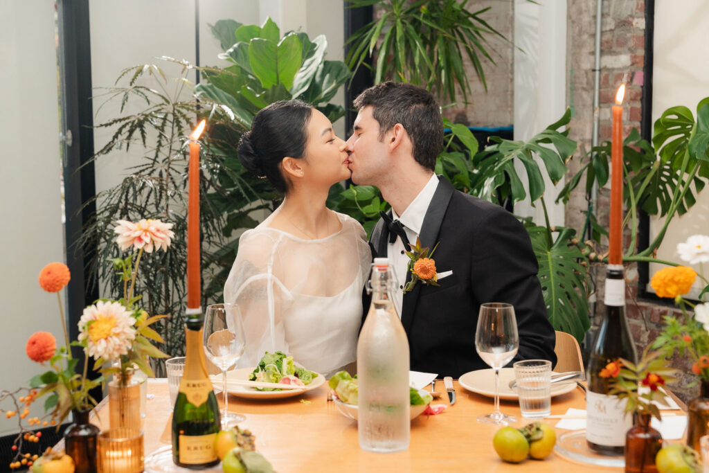 Their wedding ceremony was so emotional. Alex’s emotions were already swelling at the sight of all their family and friends from near and far gathered in the naturally lit greenery filled space. Alex cried as Ziyu walked down the aisle. Holding his hands over his chest as if his heart would explode at the sight of his bride, everyone else started to cry at his reaction. When the heartfelt vows were exchanged and the ceremony had ended, a full blown celebration was in store. Golden hour light filled cocktail hour outside as the candle lit reception space was decorated. Ziyu and Alex had collected all the empty wine bottles shared with family and friends during their engagement journey. Those bottles were then noted with who they shared it with and the date. Guests were overcome with gratitude as they found those bottles as reception decor, a reminder that they were valued in their lives. The speeches were SO funny. They brought everyone to tears to deep belly laughing back to tears.  The rest of the evening consisted of Ziyu and Alex showcasing their ballroom dance skills with their electric first dance, two outfit changes, bread cutting (instead of cake), and disco ball lit dancing!