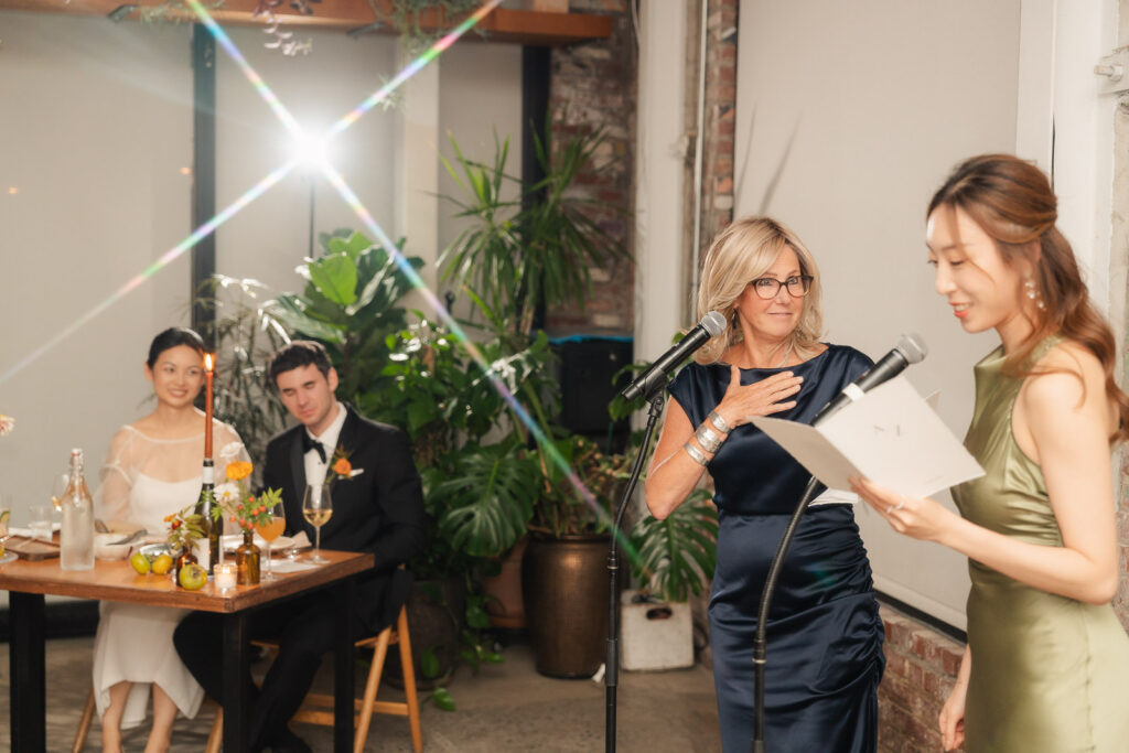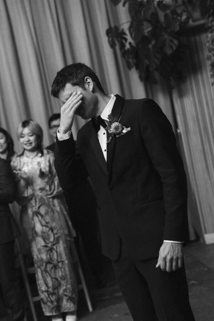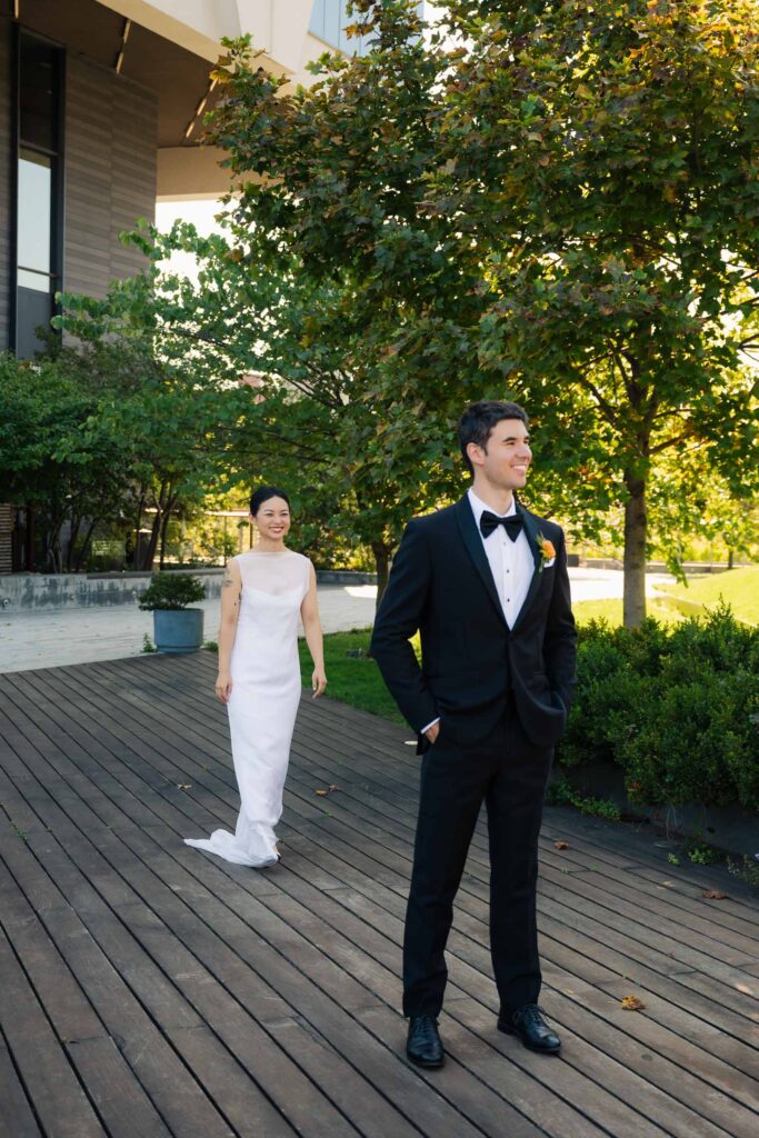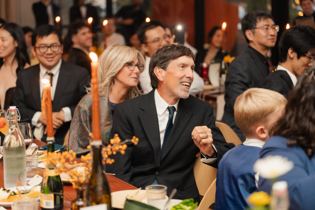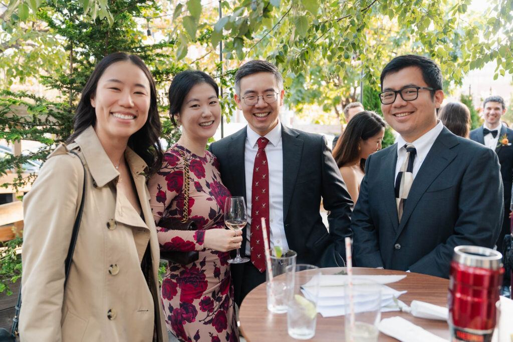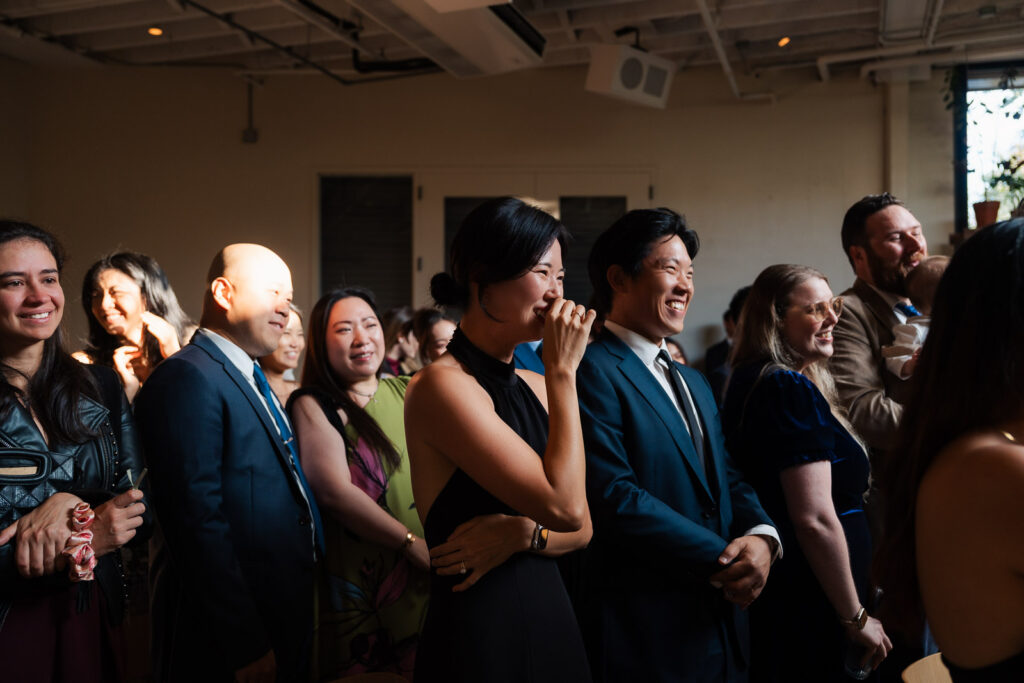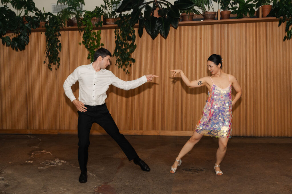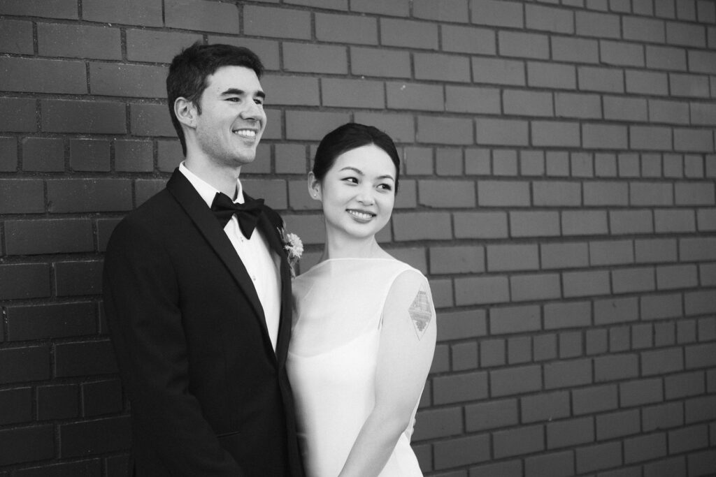 Their wedding ceremony was so emotional. Alex’s emotions were already swelling at the sight of all their family and friends from near and far gathered in the naturally lit greenery filled space. Alex cried as Ziyu walked down the aisle. Holding his hands over his chest as if his heart would explode at the sight of his bride, everyone else started to cry at his reaction. When the heartfelt vows were exchanged and the ceremony had ended, a full blown celebration was in store. Golden hour light filled cocktail hour outside as the candle lit reception space was decorated. Ziyu and Alex had collected all the empty wine bottles shared with family and friends during their engagement journey. Those bottles were then noted with who they shared it with and the date. Guests were overcome with gratitude as they found those bottles as reception decor, a reminder that they were valued in their lives. The speeches were SO funny. They brought everyone to tears to deep belly laughing back to tears.  The rest of the evening consisted of Ziyu and Alex showcasing their ballroom dance skills with their electric first dance, two outfit changes, bread cutting (instead of cake), and disco ball lit dancing!
