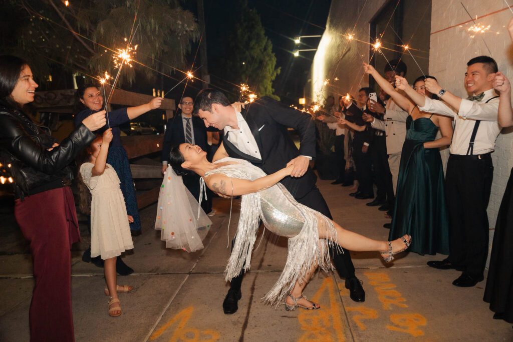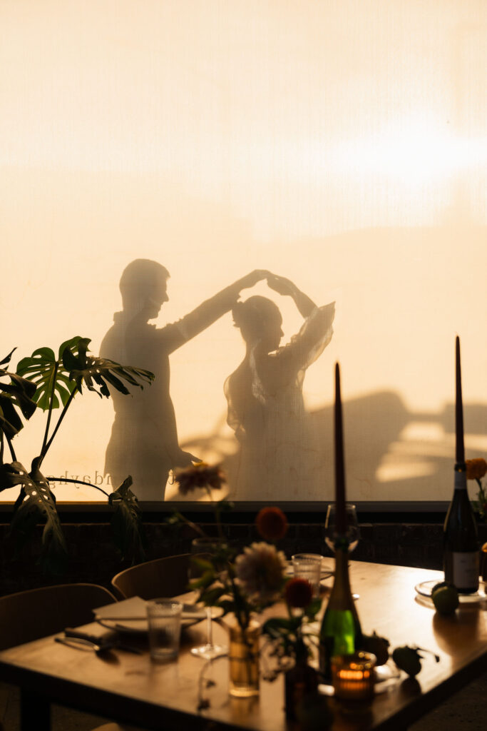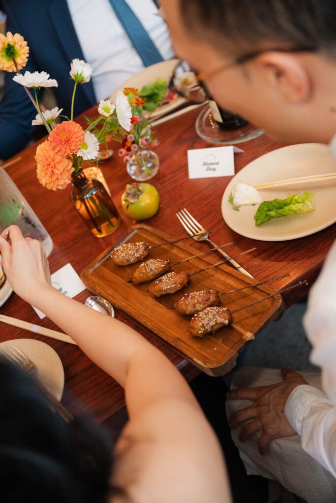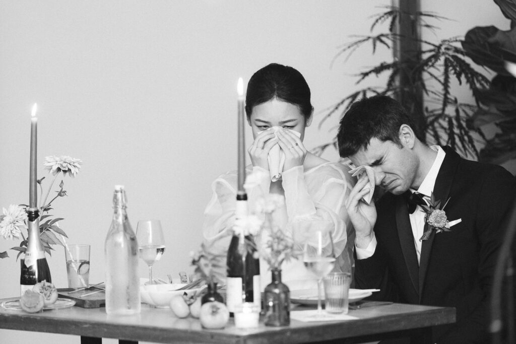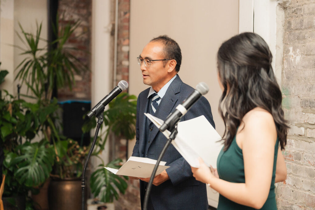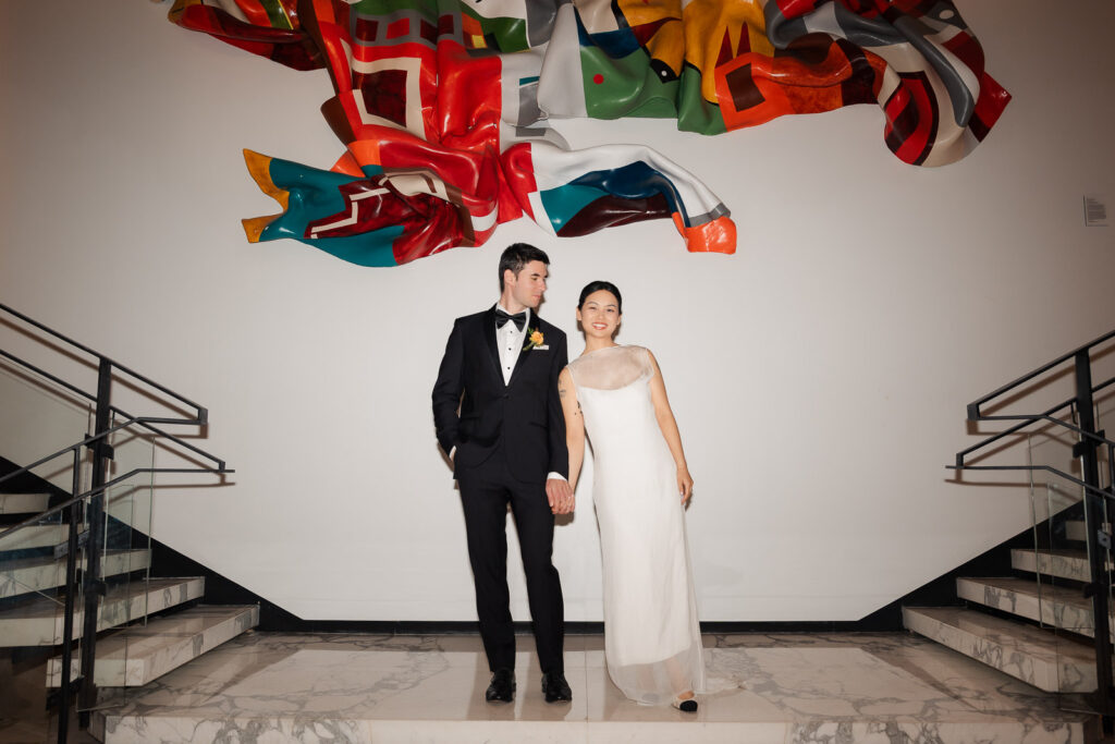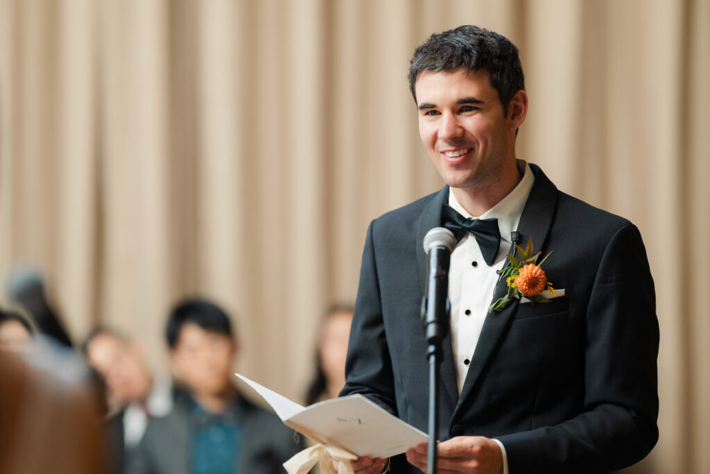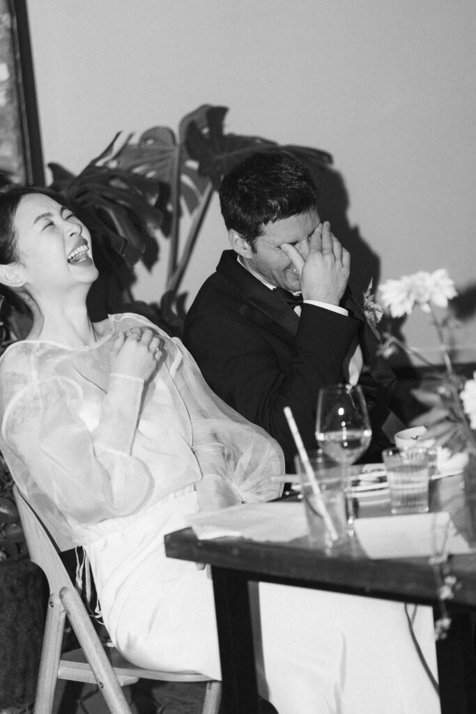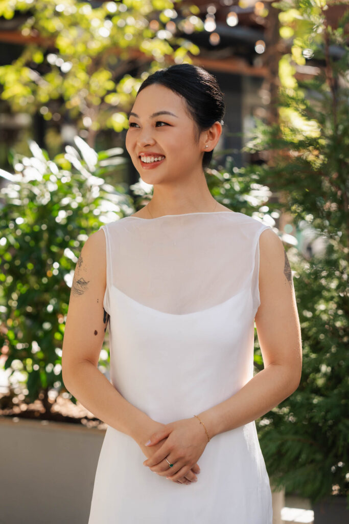 Their wedding ceremony was so emotional. Alex’s emotions were already swelling at the sight of all their family and friends from near and far gathered in the naturally lit greenery filled space. Alex cried as Ziyu walked down the aisle. Holding his hands over his chest as if his heart would explode at the sight of his bride, everyone else started to cry at his reaction. When the heartfelt vows were exchanged and the ceremony had ended, a full blown celebration was in store. Golden hour light filled cocktail hour outside as the candle lit reception space was decorated. Ziyu and Alex had collected all the empty wine bottles shared with family and friends during their engagement journey. Those bottles were then noted with who they shared it with and the date. Guests were overcome with gratitude as they found those bottles as reception decor, a reminder that they were valued in their lives. The speeches were SO funny. They brought everyone to tears to deep belly laughing back to tears.  The rest of the evening consisted of Ziyu and Alex showcasing their ballroom dance skills with their electric first dance, two outfit changes, bread cutting (instead of cake), and disco ball lit dancing!