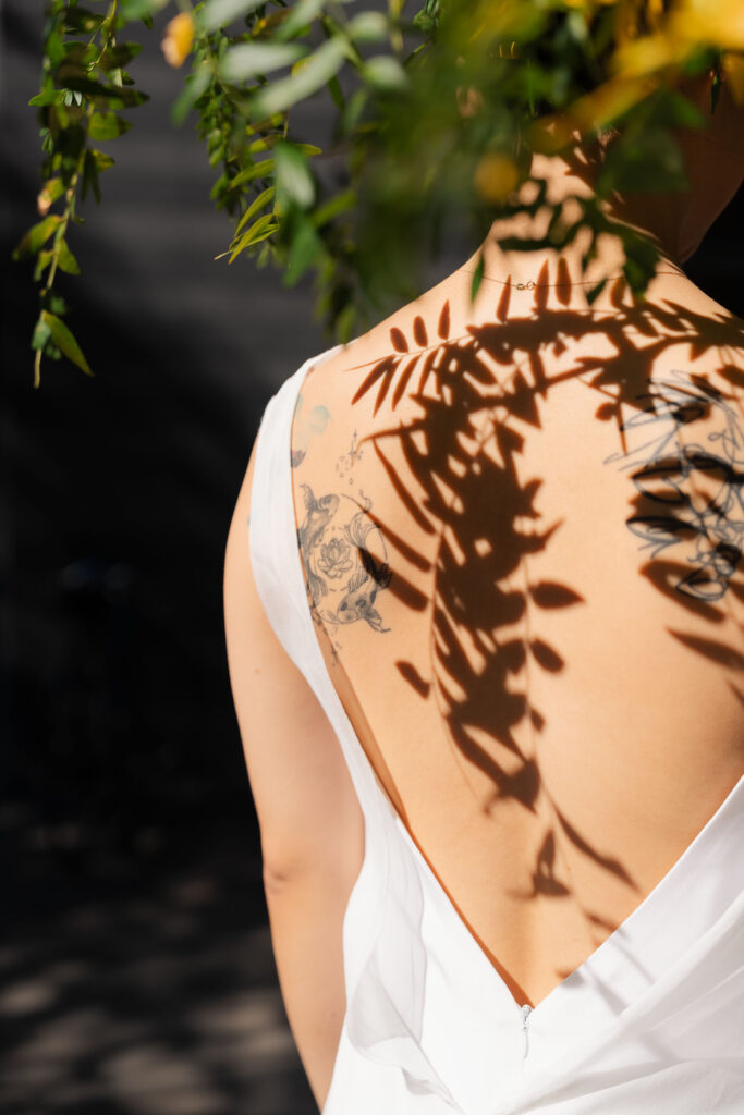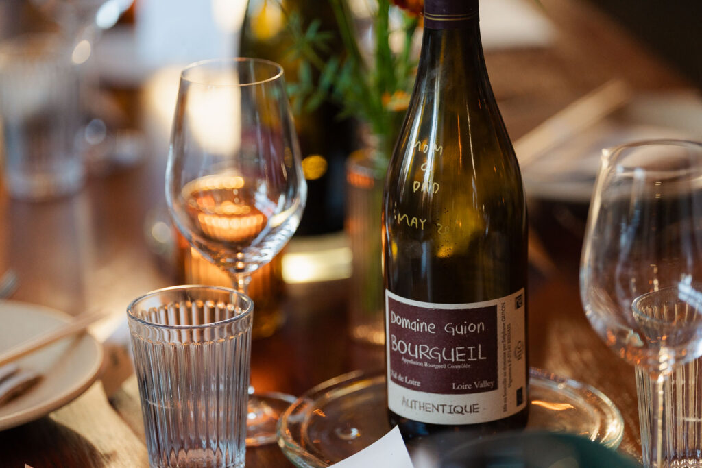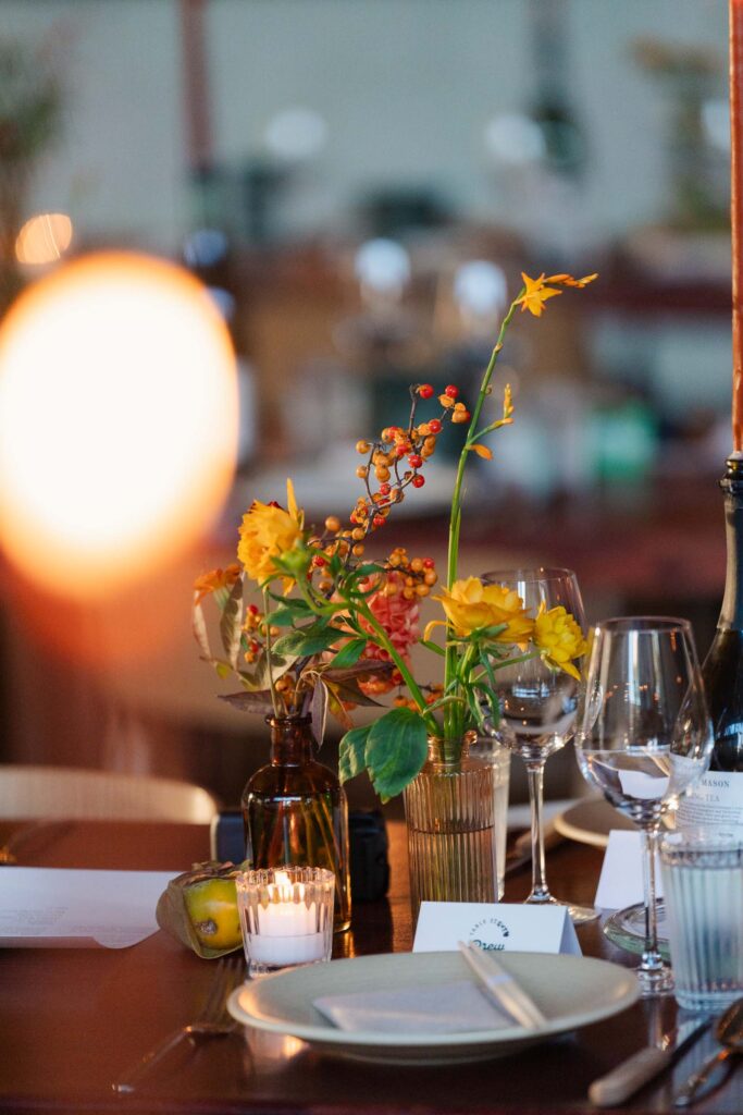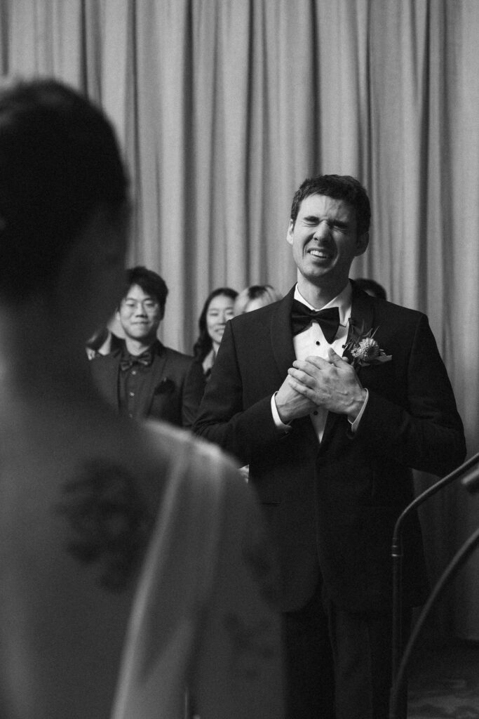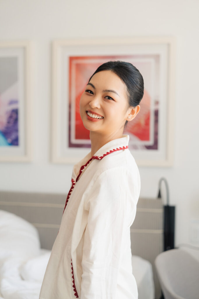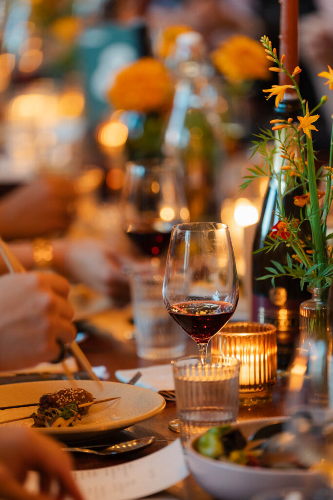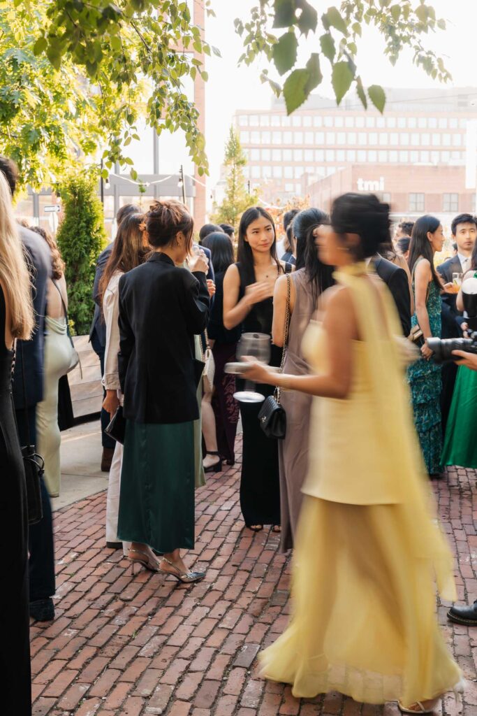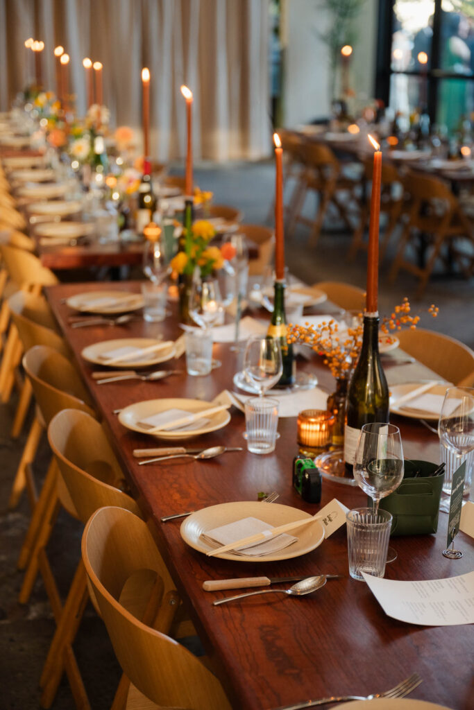 Their wedding ceremony was so emotional. Alex’s emotions were already swelling at the sight of all their family and friends from near and far gathered in the naturally lit greenery filled space. Alex cried as Ziyu walked down the aisle. Holding his hands over his chest as if his heart would explode at the sight of his bride, everyone else started to cry at his reaction. When the heartfelt vows were exchanged and the ceremony had ended, a full blown celebration was in store. Golden hour light filled cocktail hour outside as the candle lit reception space was decorated. Ziyu and Alex had collected all the empty wine bottles shared with family and friends during their engagement journey. Those bottles were then noted with who they shared it with and the date. Guests were overcome with gratitude as they found those bottles as reception decor, a reminder that they were valued in their lives. The speeches were SO funny. They brought everyone to tears to deep belly laughing back to tears.  The rest of the evening consisted of Ziyu and Alex showcasing their ballroom dance skills with their electric first dance, two outfit changes, bread cutting (instead of cake), and disco ball lit dancing!