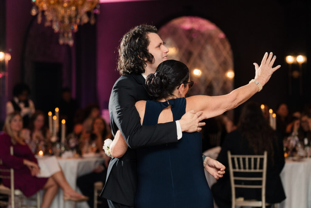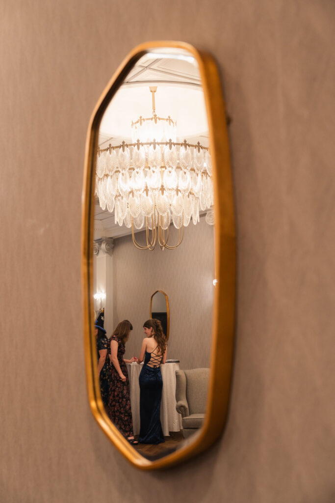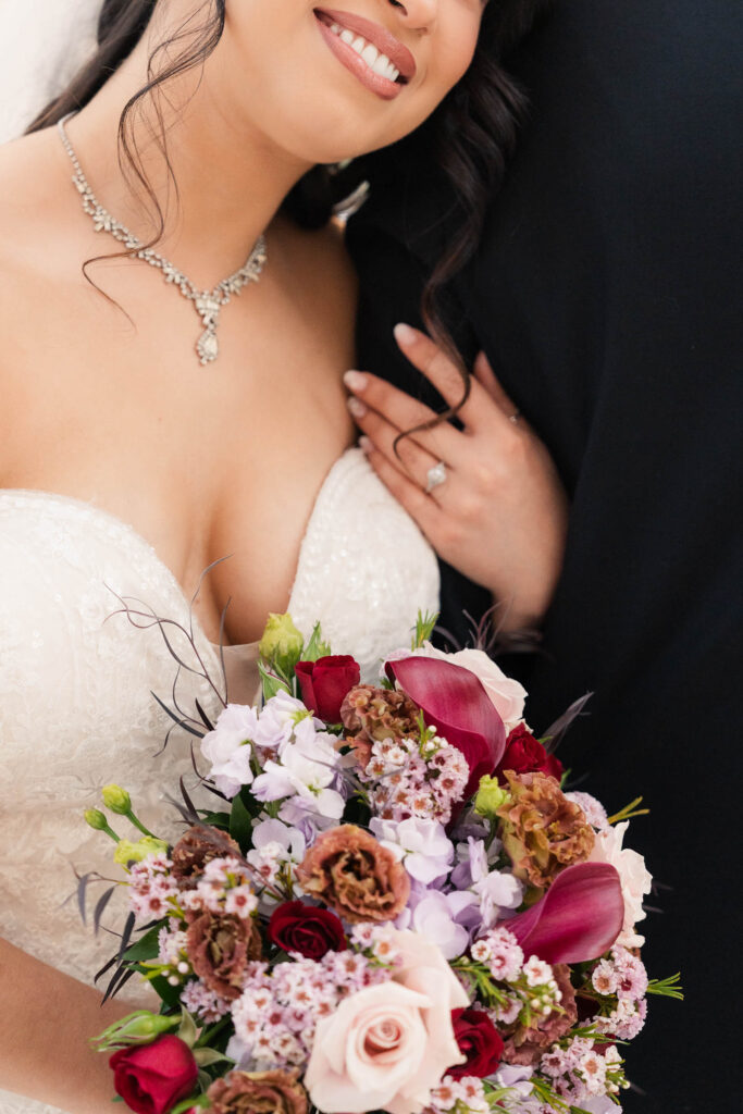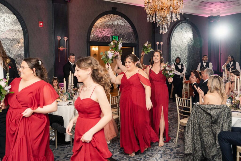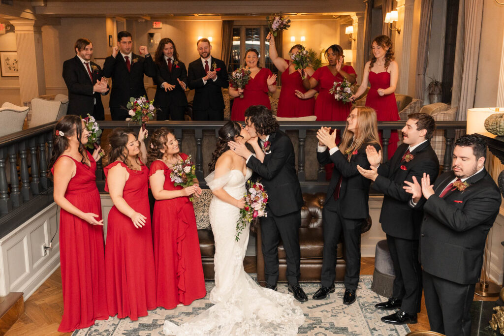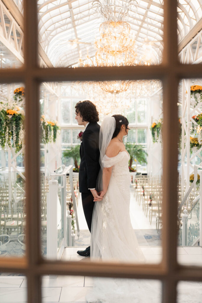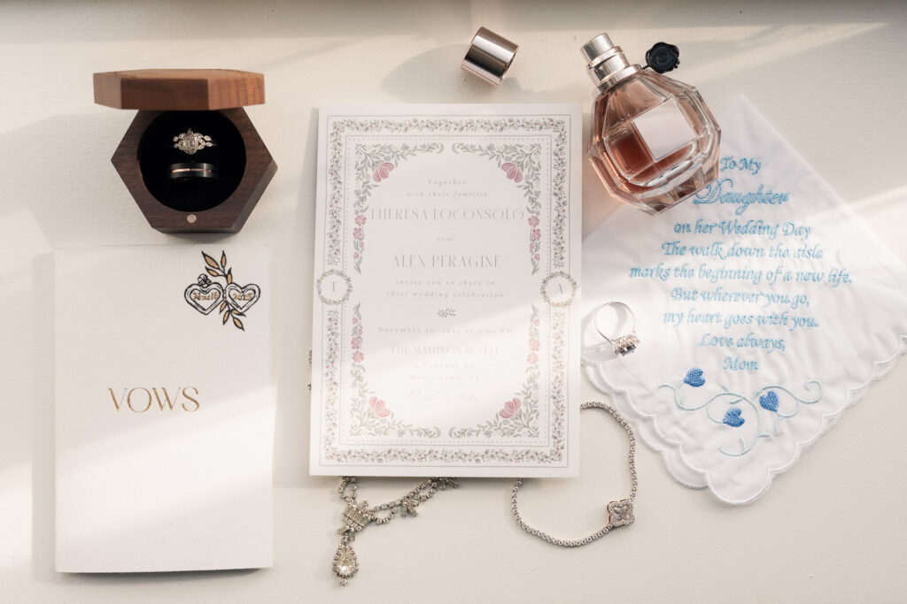 Theresa and Alex’s late autumn wedding at The Madison Hotel in Morristown, New Jersey felt effortlessly romantic, with just the right amount of drama and warmth woven throughout the day. Subtle hints of Phantom of the Opera added a personal, theatrical touch. I adore Phantom of The Opera so I was freaking out the whole time! In Theresa’s look she wore Christine’s iconic star hair clips tucked into her softly styled curls. The day began with quiet anticipation as Theresa got ready, soaking in the final moments before becoming a wife. Instead of a traditional first look, Theresa and Alex chose a first touch before their ceremony, standing just out of sight from one another. Wrapped in that private pause, they shared a few heartfelt words, grounding themselves and easing any nerves before walking into one of the most meaningful moments of their lives.