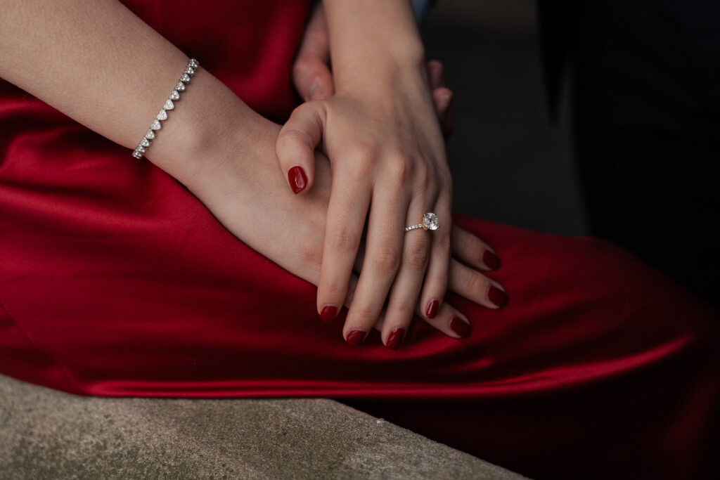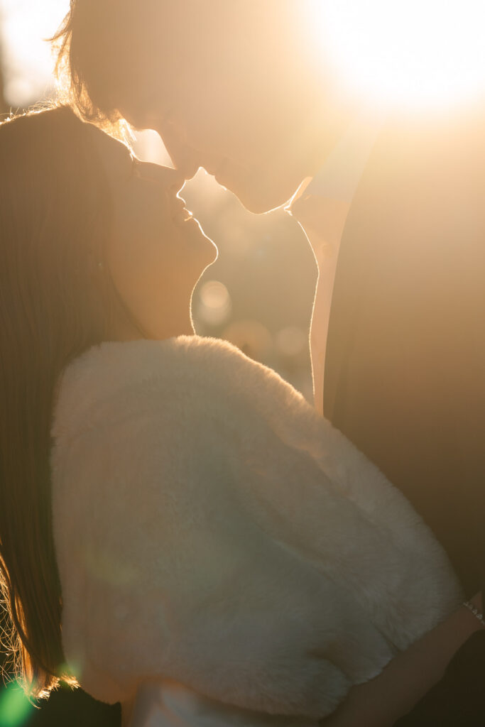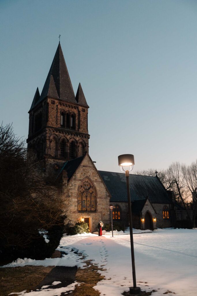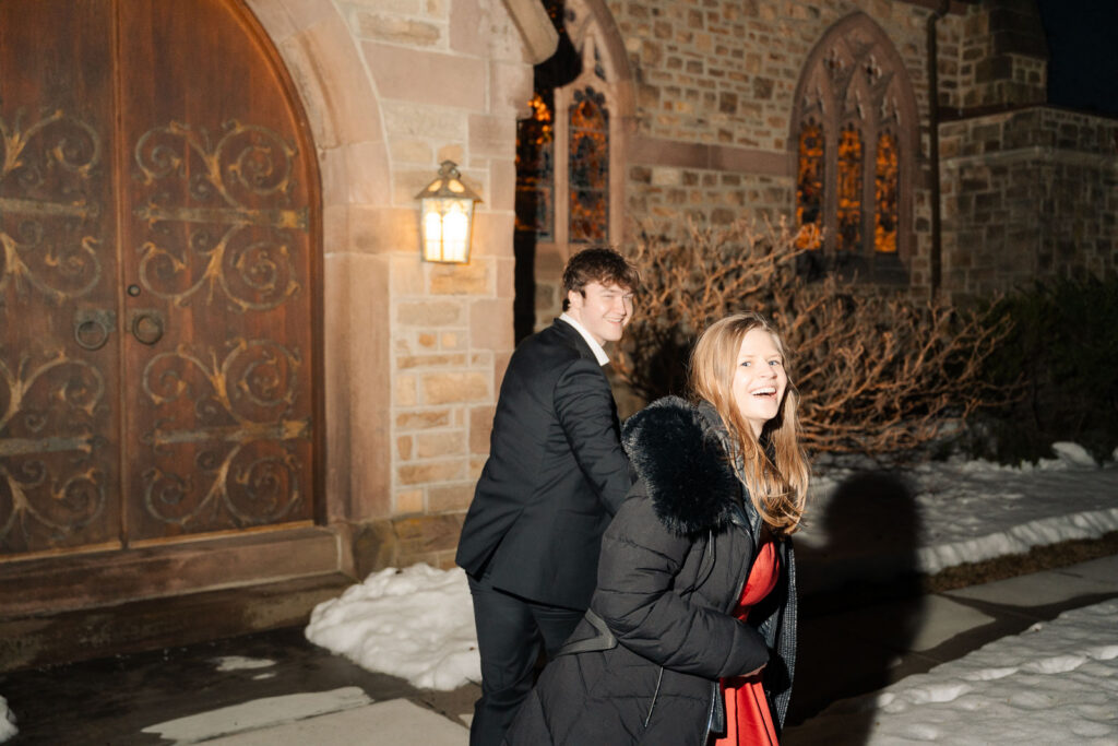 The sun was shining brightly that afternoon. Golden hour light wrapped around the campus and created a warm glow against the snowy ground. Laura, a longtime Harry Potter fan, especially loved the gothic architecture and grand archways. The setting felt cinematic and magical. We wandered through the campus, stopping beneath dramatic arches and along quiet pathways. As the sun dipped lower, the light turned rich and golden. Later, we stayed for a few nighttime portraits. The soft glow of campus lights added a moody and romantic feel to the final images. Their session perfectly blended elegance with personality. It was the sweetest way to celebrate their engagement before their wedding later this year at The Park Savoy in New Jersey.