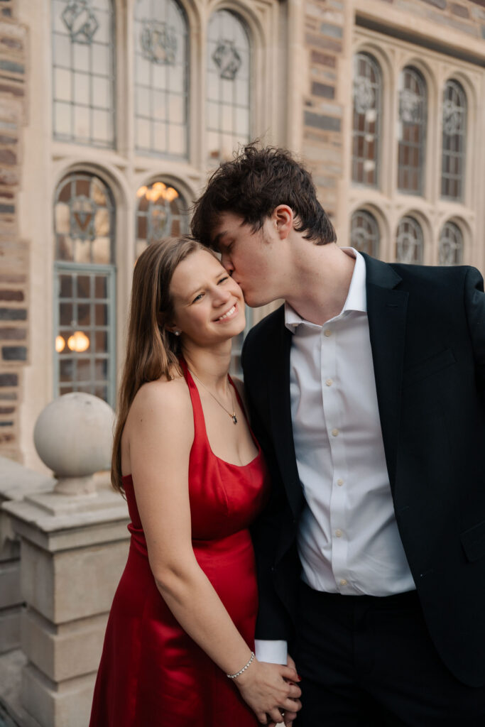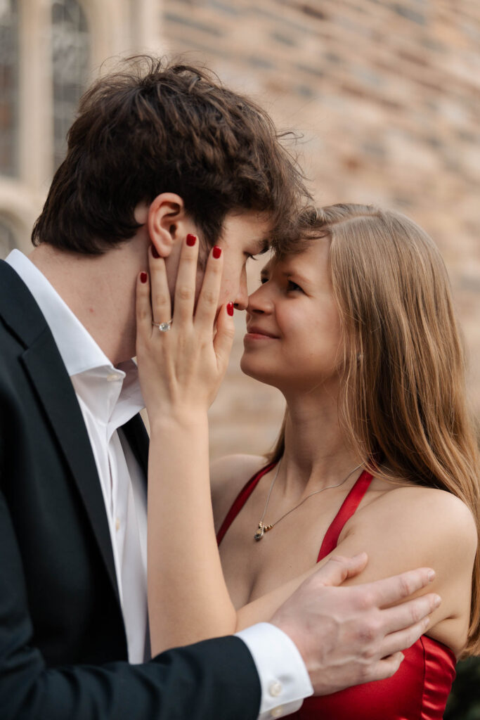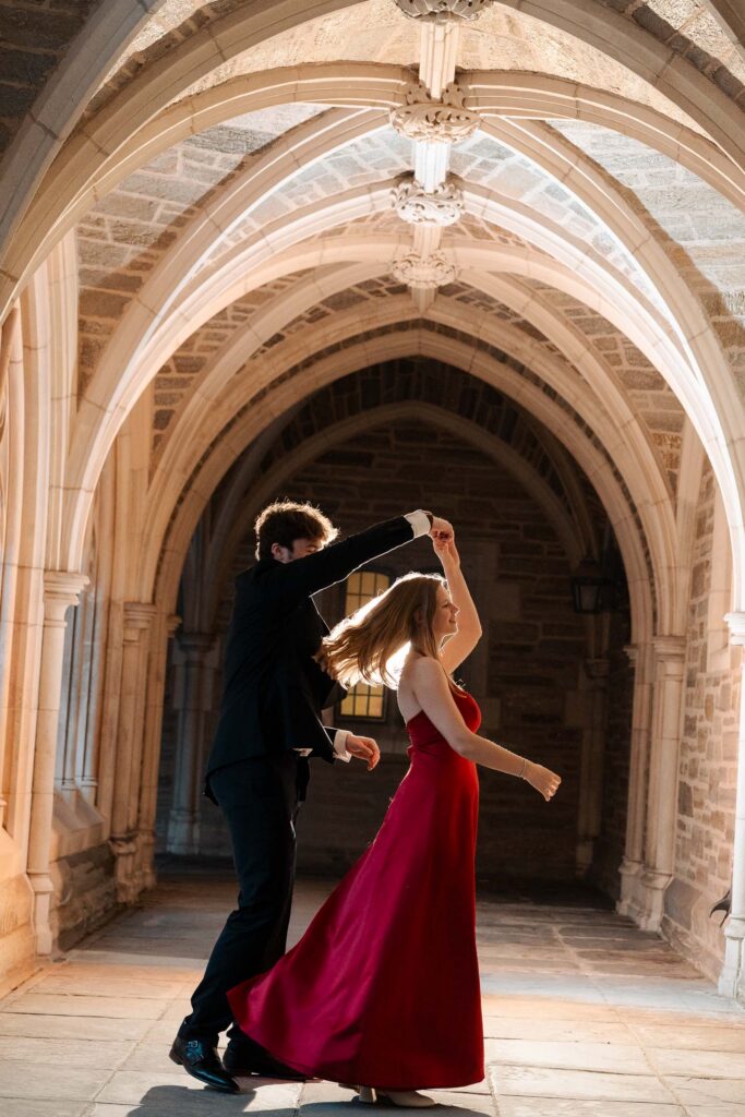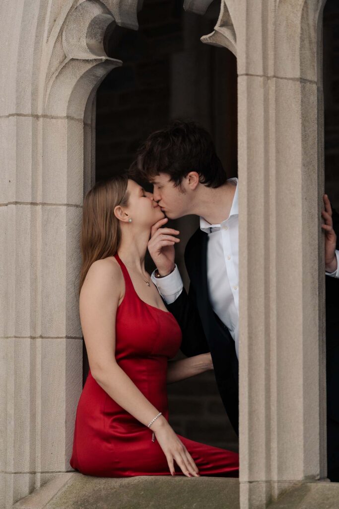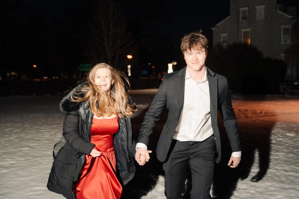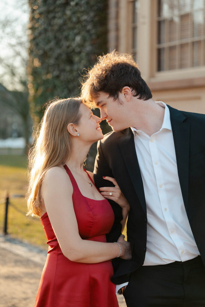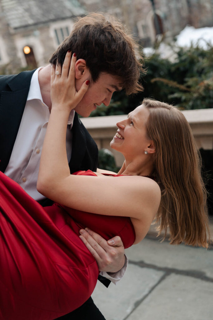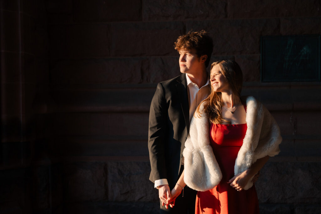 Laura and Gage’s engagement session at Princeton University felt timeless from the very first moment. The campus architecture created the perfect backdrop for their classic vision. It was late February, and the ground was lightly snow capped. The fresh snow added softness to the historic stone buildings and archways. Laura wore a stunning red ballgown that stood out beautifully against the neutral winter tones. She paired it with a white shawl for an elegant, romantic touch. Gage wore a tailored suit that complemented the look perfectly. Together, they looked like they had stepped out of a storybook.